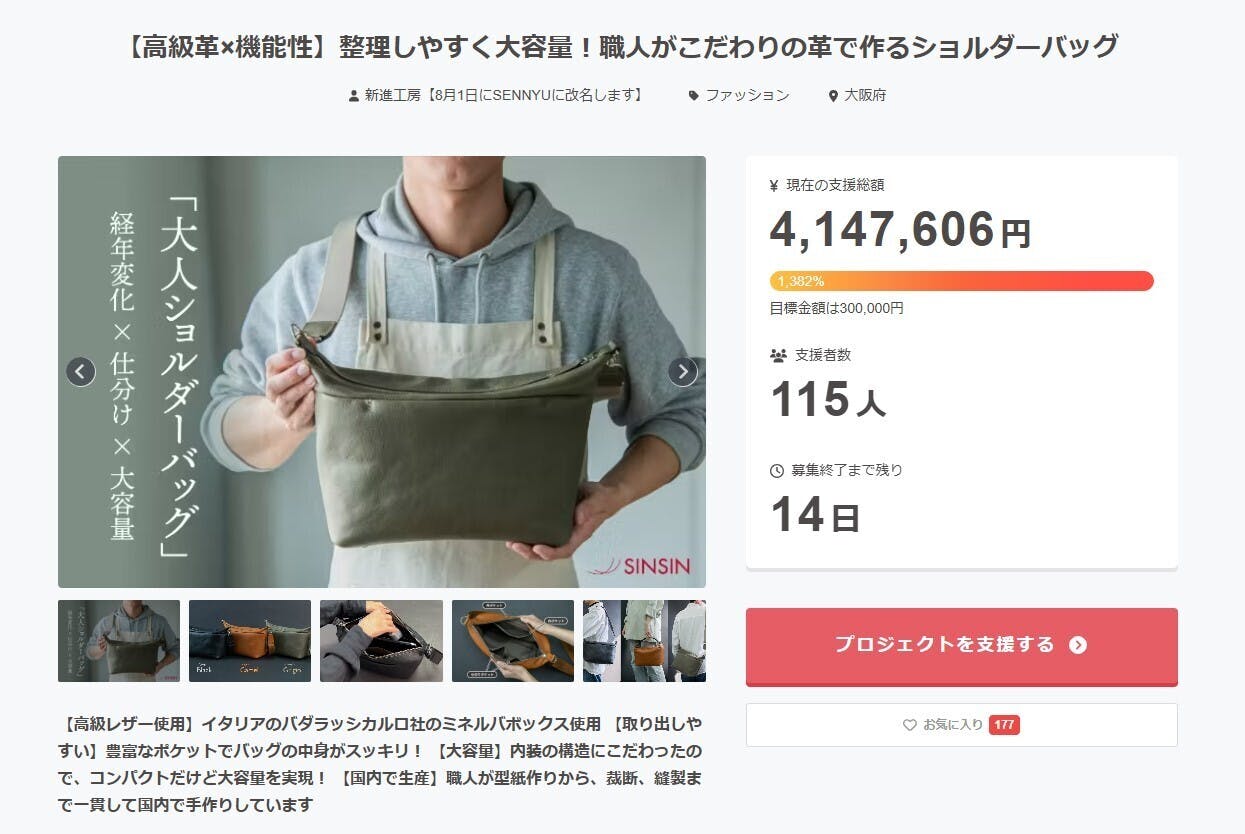 『【高級革×機能性】整理しやすく大容量!職人がこだわりの革で作るショルダーバッグ』プロジェクト