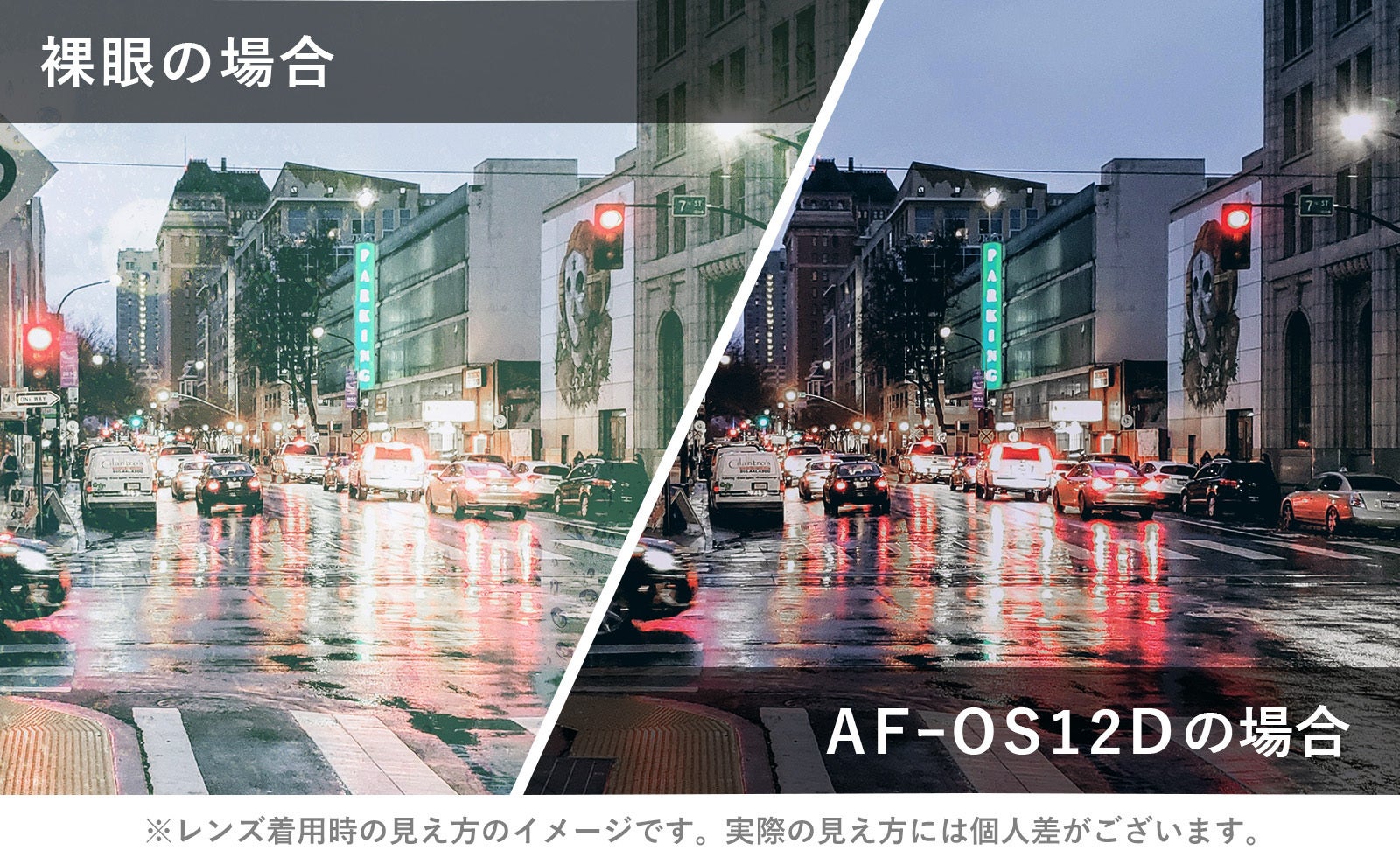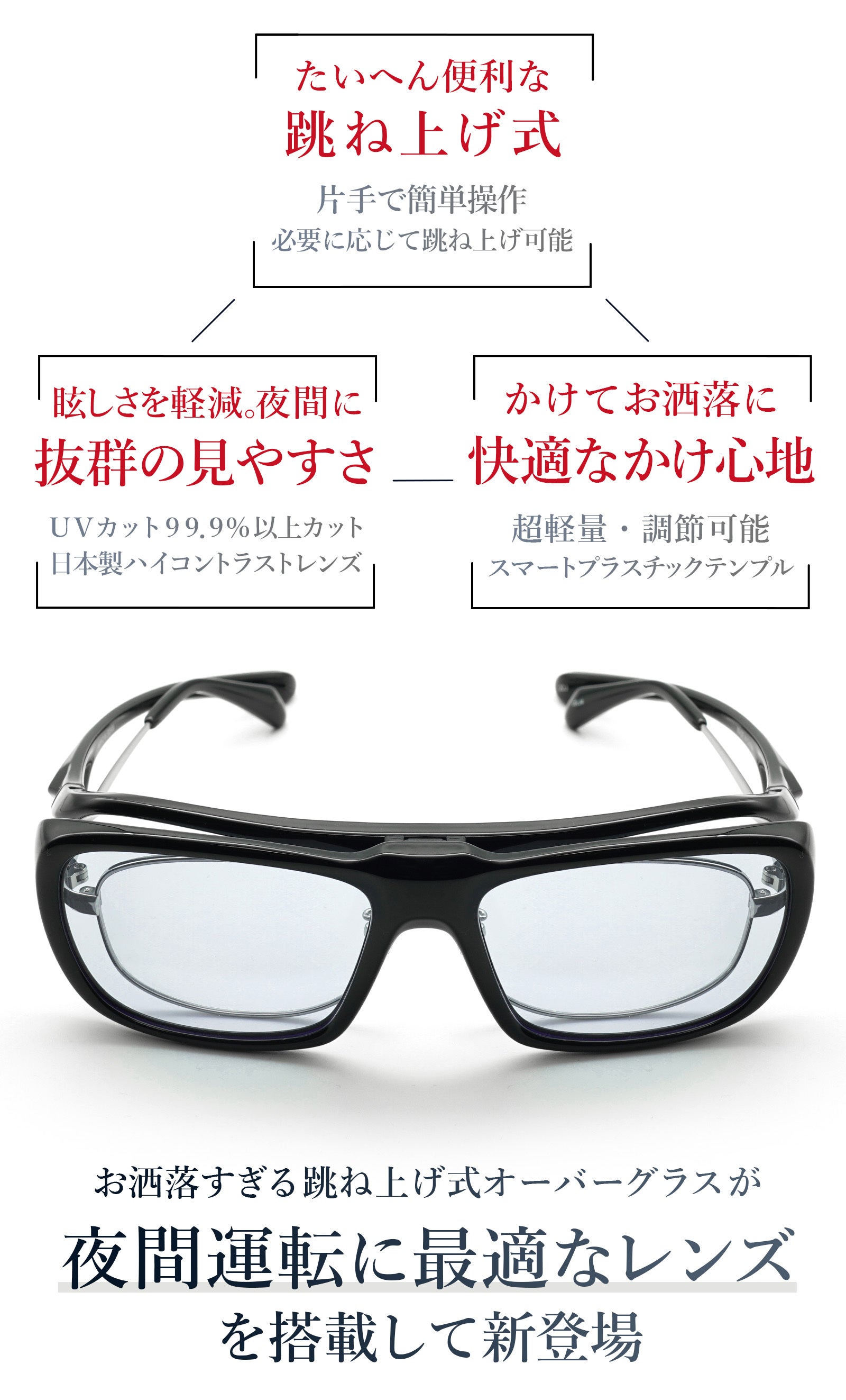 弊社跳ね上げ式オーバーグラス「AF-OS12」をベースに、夜間運転に最も適したレンズをセットしてお届けします。 ※本商品はメガネの上からかけてご使用いただく商品です。メガネ無しではご使用いただけませんのでご注意ください。