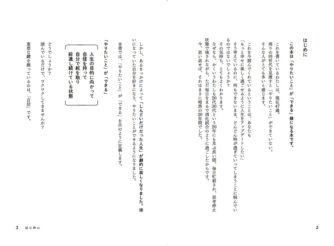 これをきっかけにして、本書に書いた通りの流れを実行すれば「自信」が手に入り、あなたの人生はびっくりするくらい好転していきます。そして「やりたいこと」が「できる」様になります。