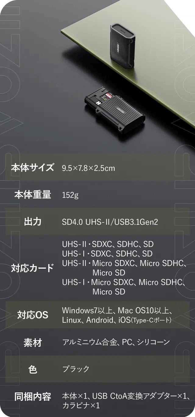 A:CAZEは、最大312MB/秒のSD4.0 UHS-IIおよび、最大10Gb/秒のUSB 3.1 Gen 2を搭載しています。(最大速度のため、ご使用の環境により異なります。)