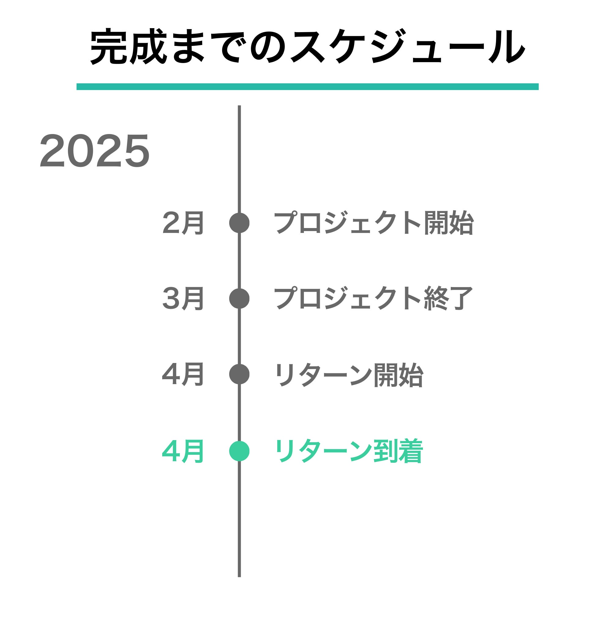 ※本文中に記載させていただいたスケジュールは、あくまでプロジェクト公開時点の予定です。クラウドファンディングを経て輸入を行う性質上、配送遅延のおそれがございます。