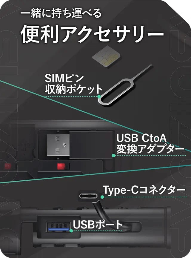 さらに、SIMピン、USBアダプター用のポケットもあり、付属品も一緒に持ち運べます。
