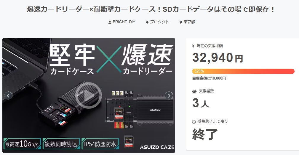 2025/04/01 00:25ご支援者様、爆速カードリーダー×耐衝撃カードケース!SDカードデータはその場で即保存!にご興味をお持ちいただきありがとうございます。プロジェクト開始から34日目で3人ものご支援者の方々より支援頂き、無事プロジェクト終了を迎えることが出来ました。早速皆様のリターンを2025年04月末にお届けできるよう準備を始めております!皆様にご満足いただけるリターンをお届けできるよう、全力で取り組んで参りますので引き続き、「爆速カードリーダー×耐衝撃カードケース!SDカードデータはその場で即保存!」をよろしくお願い致します。BRIGHTチーム もっと見る