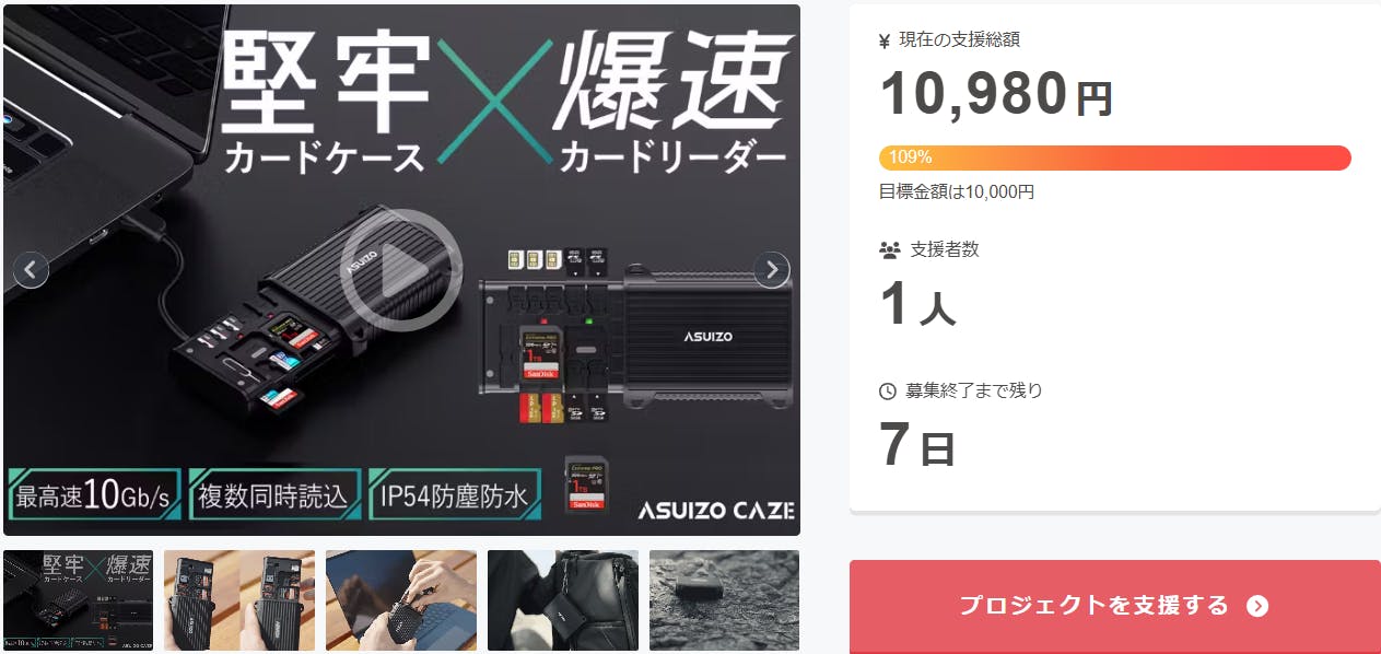 ご支援者 、「爆速カードリーダー×耐衝撃カードケース!SDカードデータはその場で即保存!」にご興味をお持ちいただきありがとうございます。ASUIZO CAZEは、SDカード、MicroSDカードのデータをすばやく保存できるだけでなく、USBポートも装備しており、3種類のポートを通じて複数のデバイス間で同時にデータを読み込むことが可能です。これにより、転送待ちの時間が大幅に短縮され、作業効率が向上します。終了までわずか7日となります。プロジェクト終了後、「爆速カードリーダー×耐衝撃カードケース!SDカードデータはその場で即保存!」をCampfire特別価格で入手することはできなくなりますので、ご支援 がまだの方、追加支援をご検討の方はお急ぎくださいますようお願い申し上げます。ご興味のある方、ぜひ支援 お願い致します。https://camp-fire.jp/projects/819207/viewBrightチームは、当プロジェクトをもっと多くの方に知っていただきたいと考えております。よかったら、FacebookやTwitter等のSNSでのシェア・拡散をお願い致します。#brightdiyどうぞよろしくお願い致します。Brightチーム