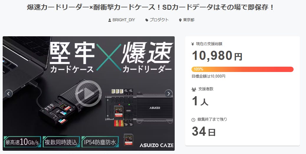 この度は「爆速カードリーダー×耐衝撃カードケース!SDカードデータはその場で即保存!」に支援頂き誠にありがとうございます!お陰様で、開始から10万円の目標金額を100%達成することができました。ご興味のある方、ぜひ支援お願い致します。https://camp-fire.jp/projects/819207/viewBrightチームは、当プロジェクトをもっと多くの方に知っていただきたいと考えております。よかったら、FacebookやTwitter等のSNSでのシェア・拡散をお願い致します。#brightdiyどうぞよろしくお願い致します。Brightチーム