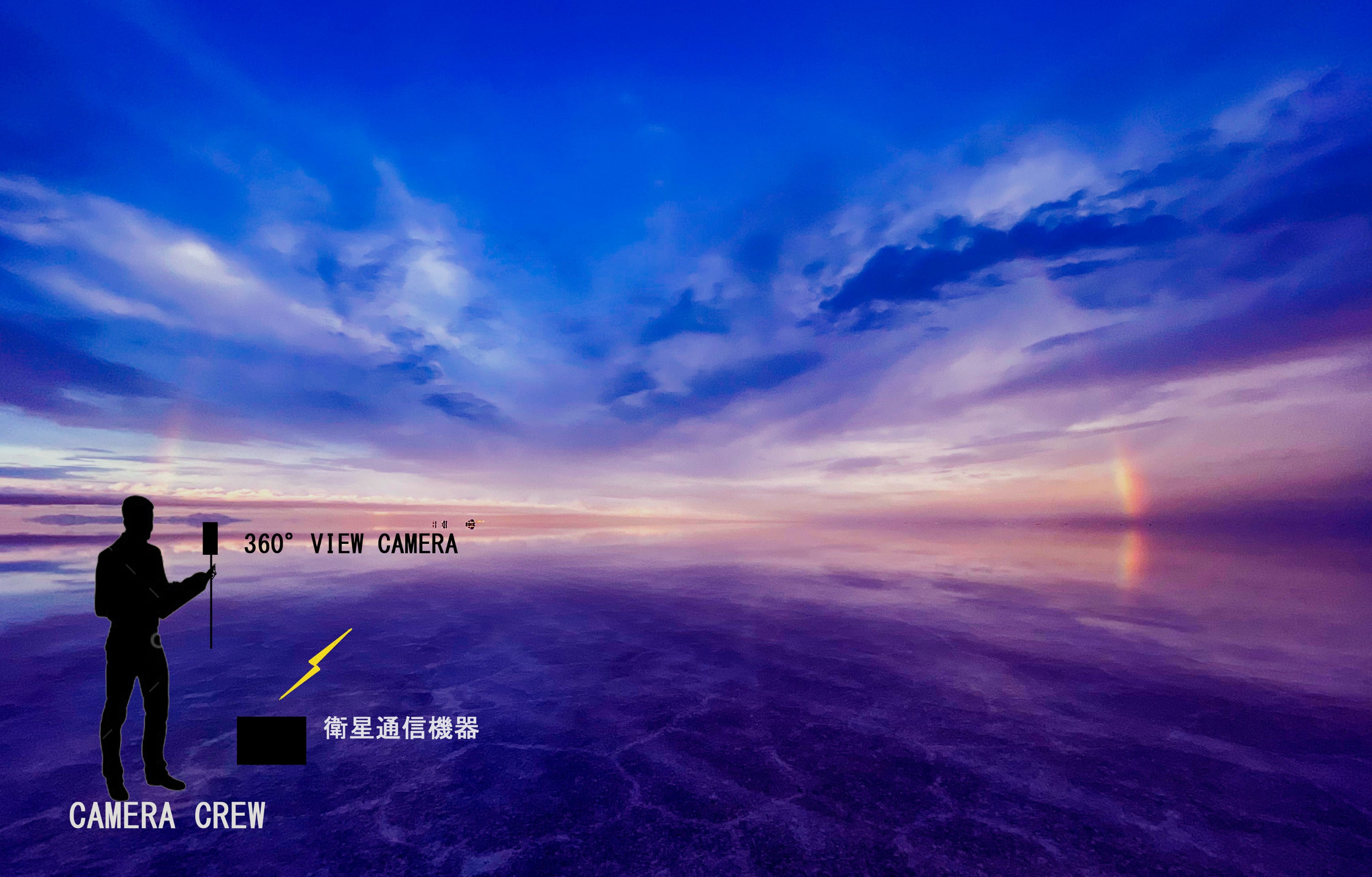 今回のプロジェクト推進に向けて、昨年2月には実際に現地ウユニ塩湖にスタッフが出向いて、テスト撮影と、通信衛星を活用したリアルタイム同時配信を行い、技術運用面での確信を得ております。