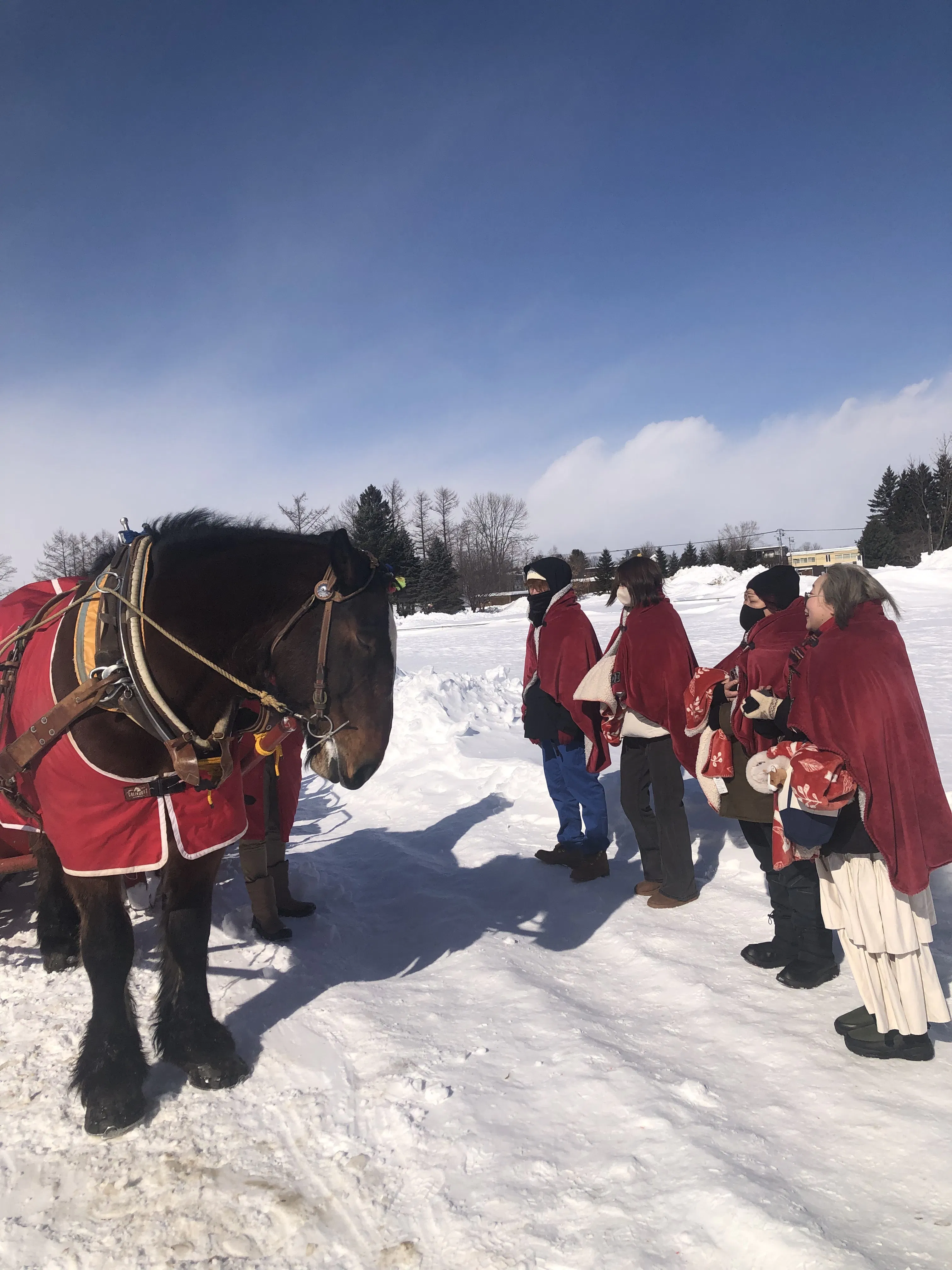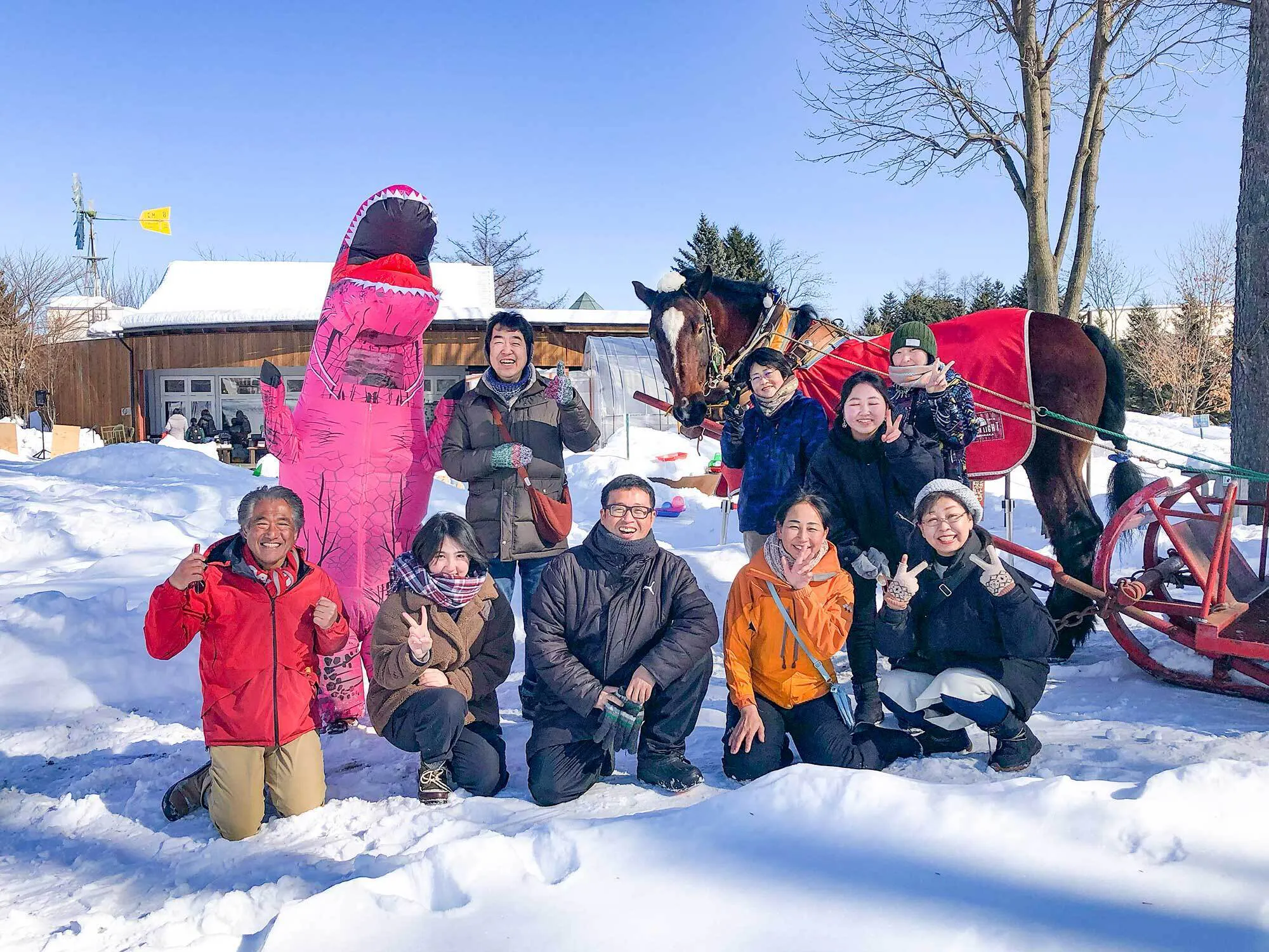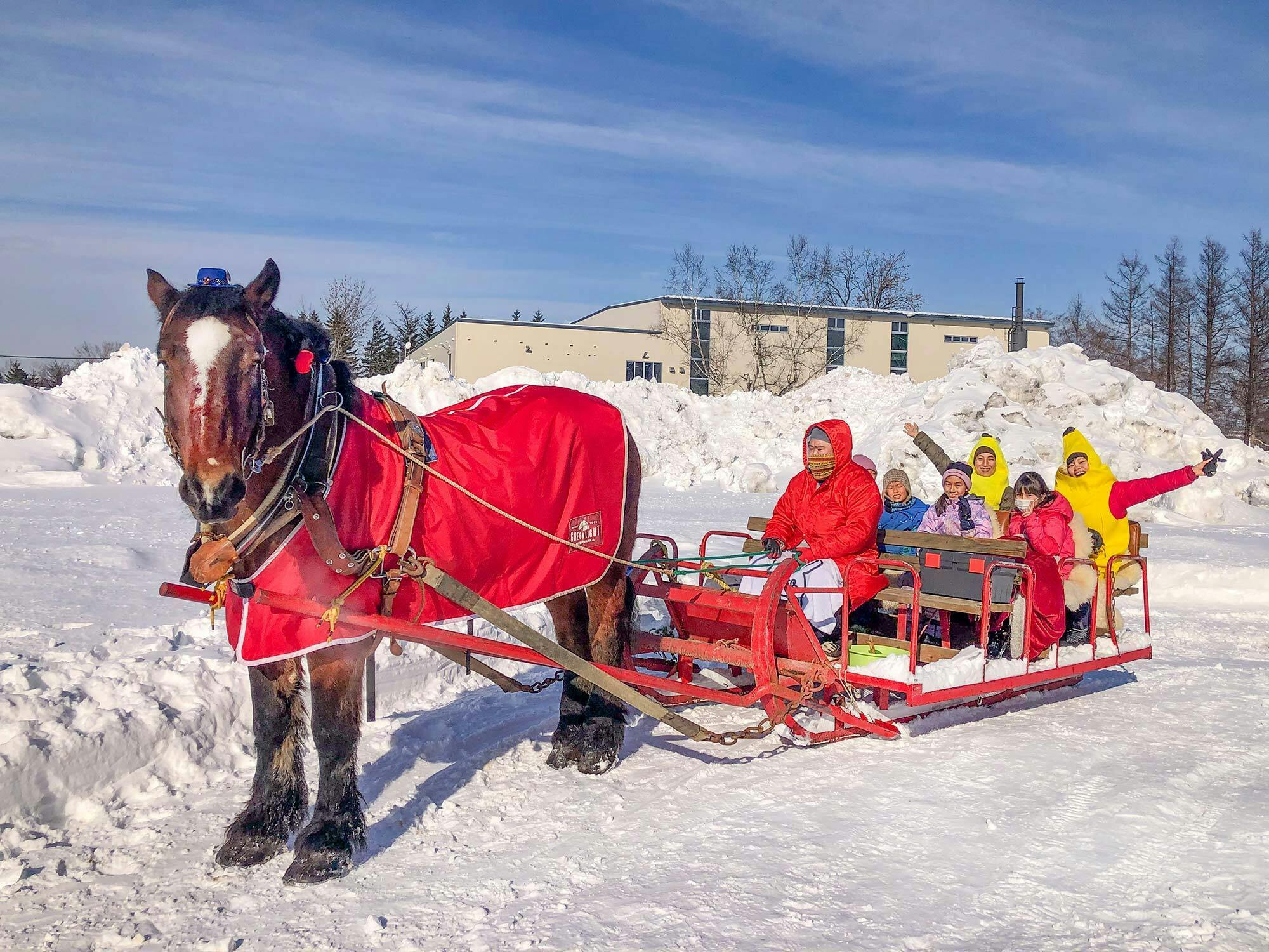 いつもは帯広の街中で「馬車BAR」を引く🐴ムサシコマが大きな雪そりを引いて麦音を巡ります。