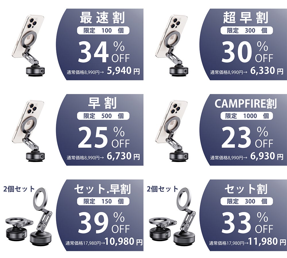 2025/03/27 16:05お世話になります!実行者株式会社SUNONEでございます。おかげ様で、本日より【電源ボタン付きの車載ホルダーX64】のプロジェクトはCAMPFIREにて公開させていただきました!早期支援はさらに10%オフの限定クーポンが配布中~↑クリックすると自動でクーポンが適用されます!そして、今回の「車載ホルダーX64」をご購入いただいた方限定で、第2弾の「車載ホルダーX64」プロジェクトで使える【100%OFFクーポン】をプレゼント!! 次回のプロジェクトをお得に応援できるチャンスです!お楽しみに!=========================①【設置簡単】置くだけ、1秒自動真空吸着!強力固定ながら、ワンボタン脱着可能、傷も跡も残らない。②【MagSafe対応】強力なN52磁石内蔵。スマホにぴったりと密着、でこぼこ道でも外れにくい。③【多関節設計】アルミ製ロボットアームが360度回転でき、角度や高さの調整が自由自在。==========================ご支援はこちらでhttps://camp-fire.jp/projects/837679/view/activities#menu目標金額達成に向けて頑張りますので、よろしくお願いいたします もっと見る