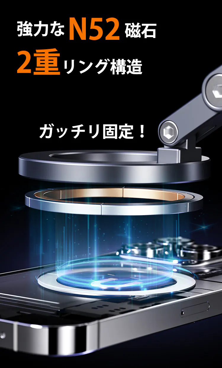 スマホリンク部分には、強力な「N52」磁石を2重リング構造で採用し、スマホやiPadにぴったりと密着。これにより、通常のマグネットよりも強力な磁力を実現し、でこぼこ道でもスマホが落ちる心配はありません。