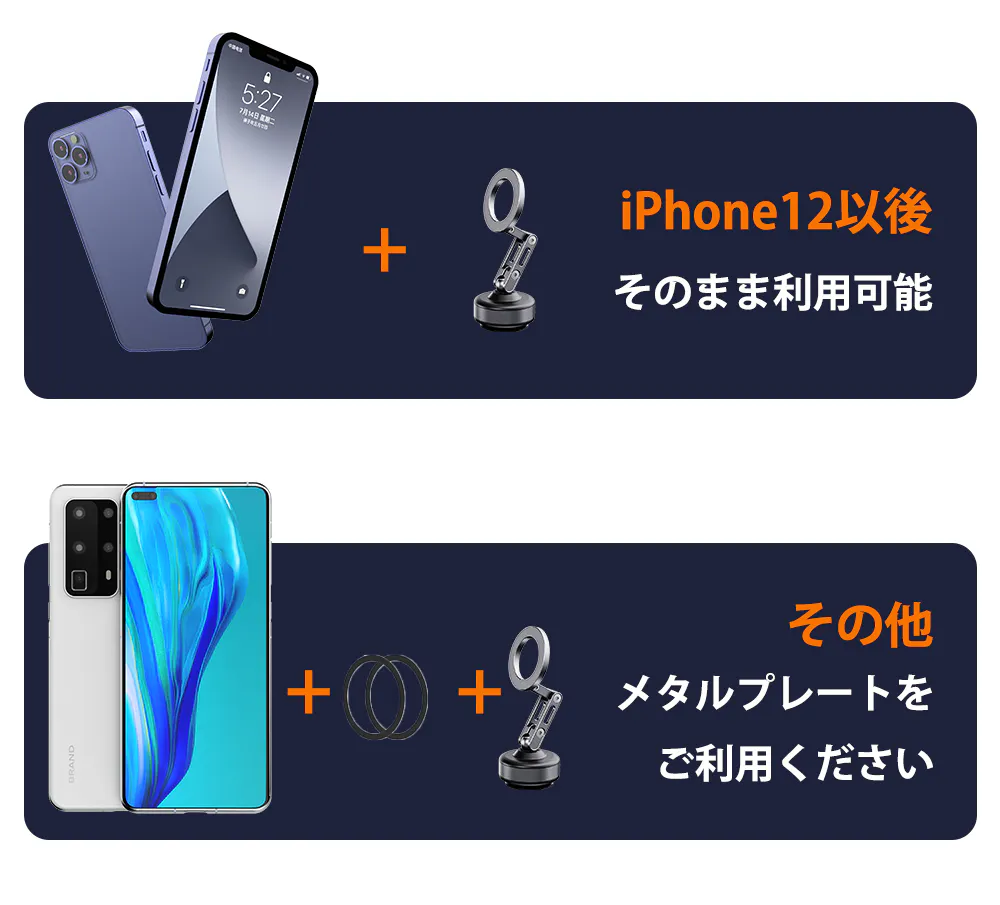 ※非MagSafe対応のスマートフォンやスマホケースには、メタルプレートをケースの外側に取り付ける必要があります。メタルプレートが1枚付属します。