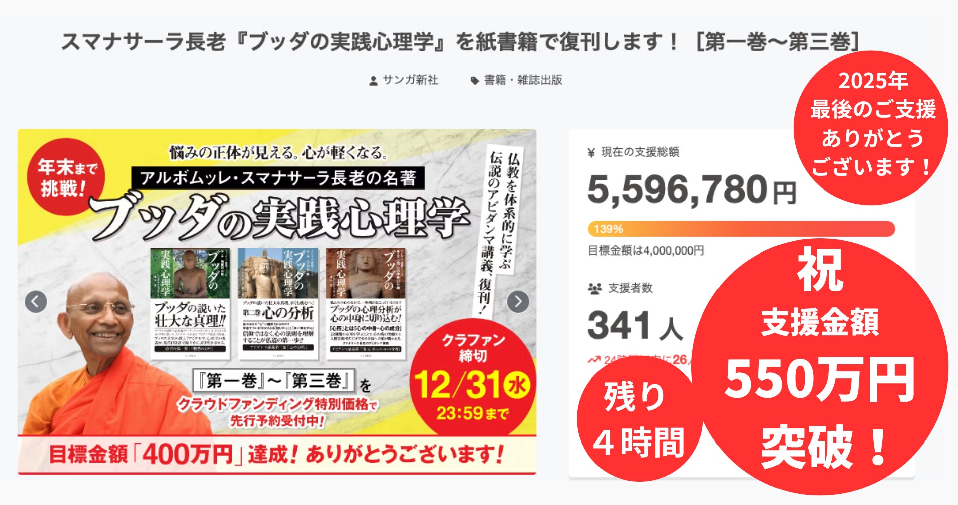 2025/12/31 19:07スマナサーラ長老『ブッダの実践心理学』を紙書籍で復刊します![第一巻〜第三巻]↓https://camp-fire.jp/projects/898788/view支援総額は550万円を超え、最終日を迎えています2025年の大晦日、スマナサーラ長老『ブッダの実践心理学』復刊プロジェクトは、いよいよ最終日を迎えています。12月29日に支援総額500万円を超え、その後も多くのご支援が重なり、先ほど「550万円」を超えることができました! 12月31日19時時点の支援総額は559万6780円。支援者数は341人となりました。この24時間においても、26人もの方々から温かなご支援をいただいています。お一人お一人の慈悲と共感の積み重ねにより、ここまで辿り着くことができました。心より、深く御礼申し上げます。皆さんからのメッセージをご紹介します!締切が近づくにつれ、お申込みとともに、このプロジェクトへの想いや応援の言葉が、次々と寄せられています。皆さんのメッセージから、『ブッダの実践心理学』が今も多くの方にとって必要とされていることが伝わってきます。その一部を以下にご紹介いたします。◆古本屋を探し回って全巻購入し読了しました。人生が変わるほど勉強になりました。まだ読まれてない方に届けたいと思い支援させていただきます。◆分かりやすい本と伺い、大変期待しております!ぜひ読破し、仏教への理解を少しでも深めたいと思います。応援しております。頑張ってください!◆ブッダの実践心理学は仏教を理解する上で欠かせない本だと思います。図書館で借りて読んでいましたが、全巻揃えてもう一度しっかりと読みたいと思います。復刊にご努力いただいたサンガ新社をはじめ、関係者の皆様に感謝いたします。誠にありがとうございます。◆お釈迦様の教えがたくさんの人々に広まりますように。応援しています!頑張ってください!◆日本で”真の仏道”に接する機会になかなか巡り合えないのでは、、と感じます。出版、よろしくおねがいいたします。◆応援しています!頑張ってください!いつもありがとうございます。◆生きとし生けるものが幸せでありますように◆御本を拝読する事を楽しみにしています。◆サンガさんには本当に感謝しています。サンガさんの本のお陰で、仏教の知識が深まりました。これからも、どうぞよろしくお願いいたします。◆仏教が広く長く伝わっていくことをお祈りします。◆たくさんの方に読んでいただけますようお祈りいたします。◆お釈迦様の教えが理想的な形で理解されていきますように!!!◆ブッダの実践心理学シリーズの紙書籍が復刊される事を心待ちにしており、とても嬉しく思っています。第四巻以降のクラウドファンディングもお待ちしております。◆スマナサーラ長老のおかげで毎日元気に生きていくことができておりますm(_ _)m◆アビダンマは、仏教で最も高度な教えです。これをスマナサーラ長老が解説なさった素晴らしい本だと思います。すでに昔の版で全巻を持っていますが、ずっと復刊を望んでおりました。復刊頂いたサンガ新社様に感謝を込めて、支援させて頂きます。仏教を志す方にとっても、この本は大変、貴重な本となるので、とても有難いことだと思います。誠にありがとうございました。そして、いつも貴重な本をありがとうございます。◆応援しています!頑張ってください!少額ですが役立ててください。◆復刊ありがとうございます!応援しております!◆お釈迦様をはじめ。スマナサーラ長老殿。サンガ新社様。このプロジェクトに関わる全ての方に感謝いたします。と同時に、心の底から応援しております。生きとし生ける全ての生命が幸福になりますように。◆生きとし生けるものが幸せでありますように世に正法が広まりますように◆この本のシリーズを途中まで読ませていただいております。復刊のこのご活動があることに大変ありがたい気持ちです。◆ずっと学んでみたいと思っていました。楽しみにしています!◆お本の再販、嬉しく思います。応援しています!◆このような貴重な内容の本を出版してくださり、いつもありがとうございます。◆以前から【アビダンマ】に興味がありました。復刊プロジェクト頑張ってください!◆生きとし生けるものが幸せでありますように…◆目標額達成おめでとうございます。本の完成を楽しみにしております。◆大変貴重な本を復刊して下さり、ありがとうございます。この本が、少しでも多くの方に届くことを願っております。◆全ての生命が幸せでありますように。ありがとうございます。◆微力ですが引き続き応援します!沢山の人々に仏教の教えが広がって、悩み苦しみがなくなる事を願っています。クラウドファンディングの締切は、本日23:59です今回の先行予約は、復刊書籍を特別価格で確実に手に取っていただける最後の機会であり、今後『ブッダの実践心理学』シリーズを継続して復刊していくための、大切な礎となります。残された時間は、あと4時間。2025年の最後の時間までと