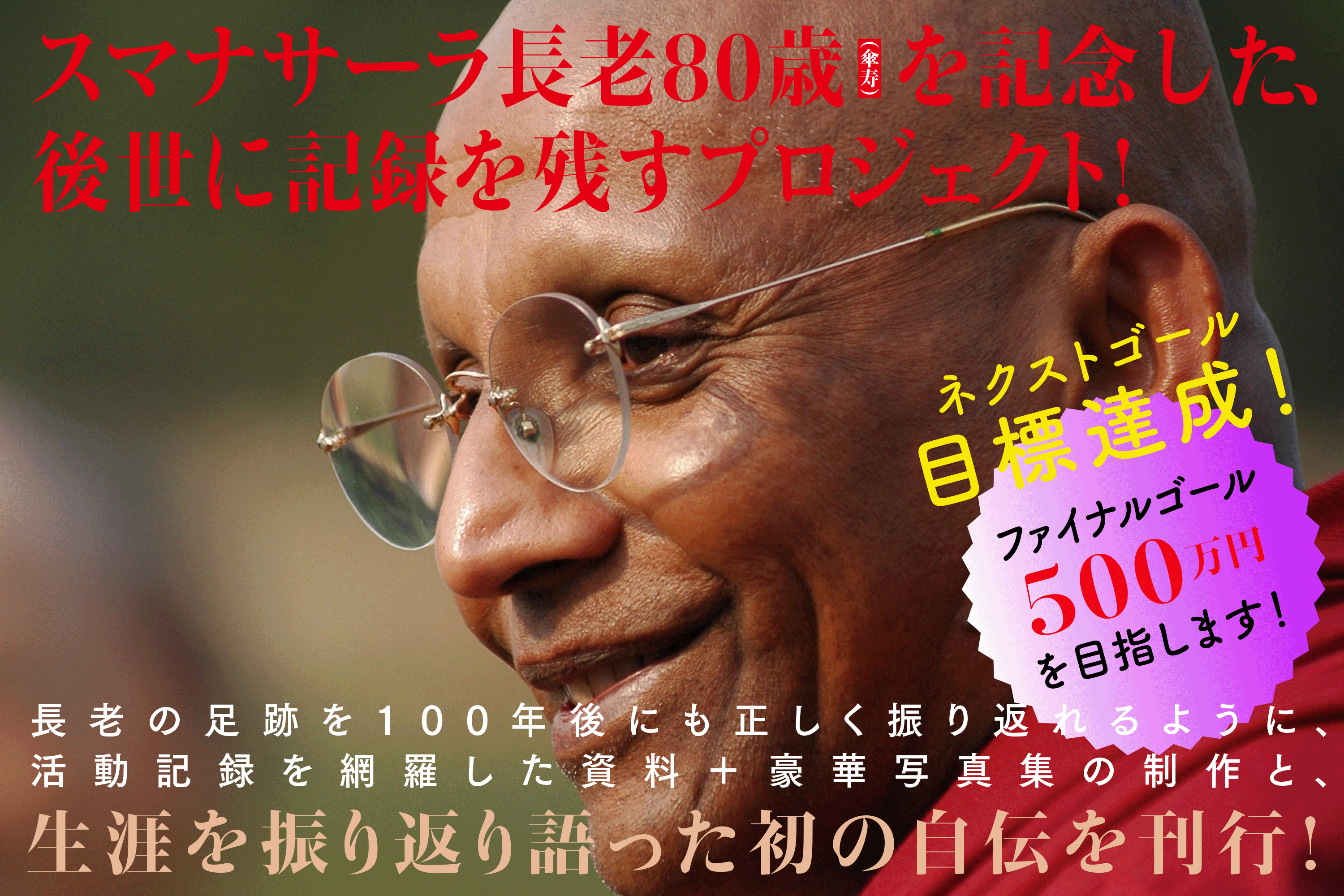 このプロジェクトは、アルボムッレ・スマナサーラ長老の80歳(傘寿)を記念し、スマナサーラ長老のこれまでの歩みや教えを後世に伝える2冊の書籍を刊行するものです。