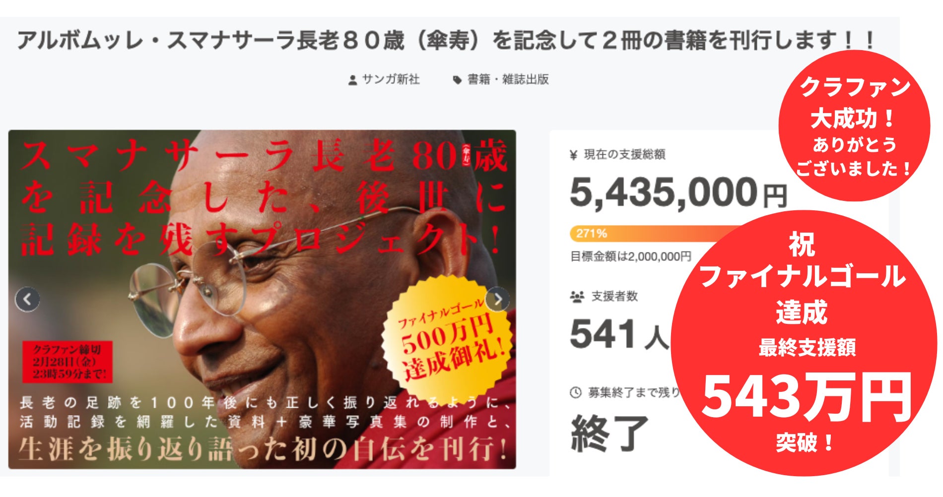 「アルボムッレ・スマナサーラ長老80歳(傘寿)を記念して2冊の書籍を刊行します!!」クラウドファンディングは、2025年2月28日(金)23時59分 に終了しました。