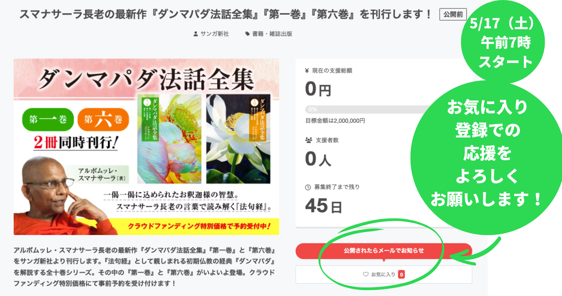 今回の『ダンマパダ法話全集』『第一巻』『第六巻』刊行のクラウドファンディングは、「5月17日(土)午前7時」にスタートします。