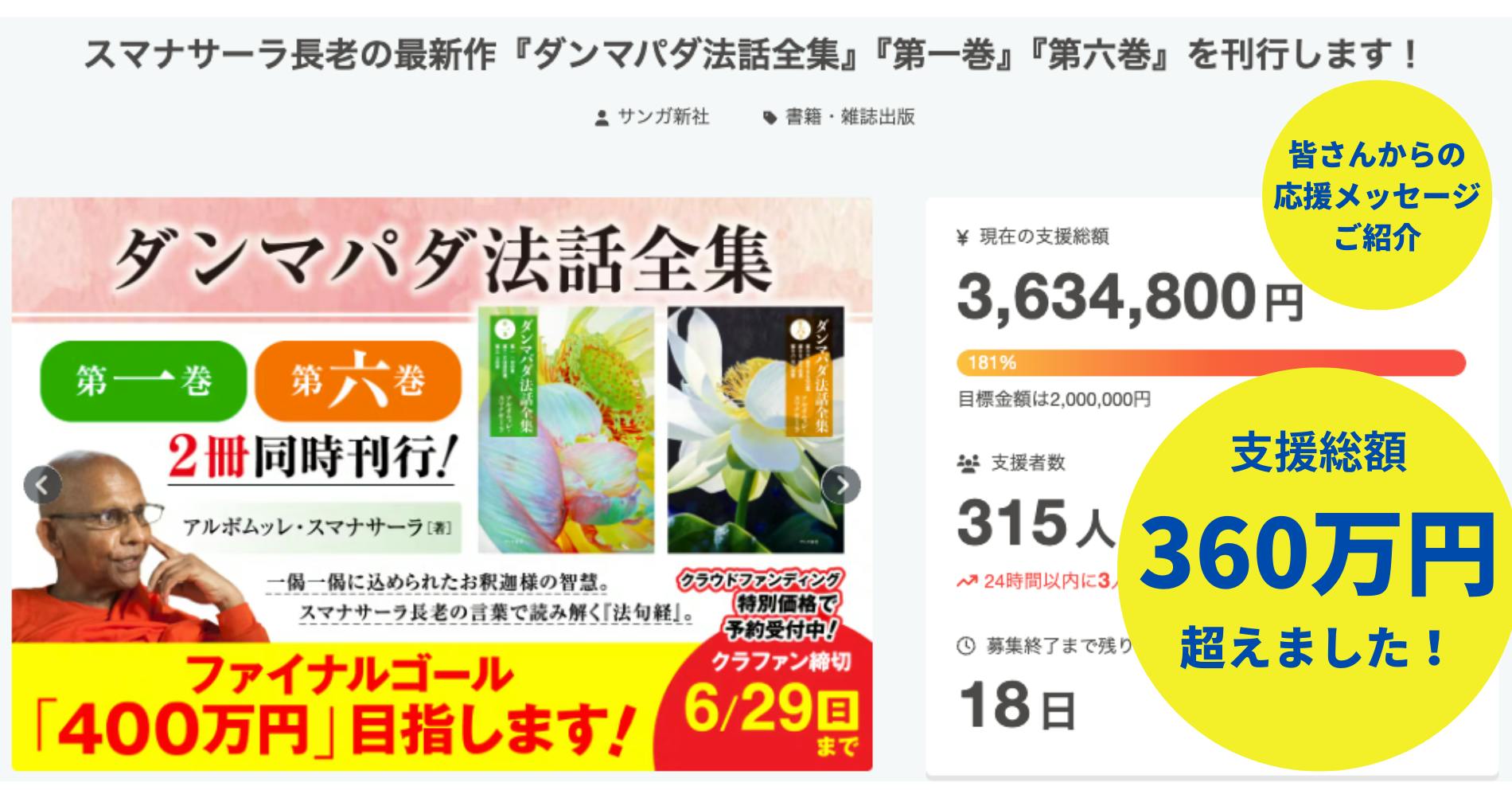 スマナサーラ長老の最新刊『ダンマパダ法話全集』『第一巻』『第六巻』の刊行を目指す本クラウドファンディングは、6月11日現在で、363万円・315人ものご支援を頂戴しております。
