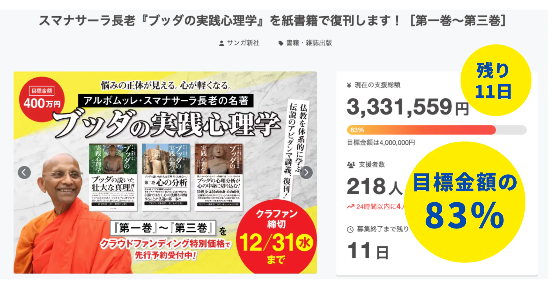 11月22日から実施している「スマナサーラ長老『ブッダの実践心理学』を紙書籍で復刊します![第一巻〜第三巻]」クラウドファンディングは、いよいよ残り11日となりました。