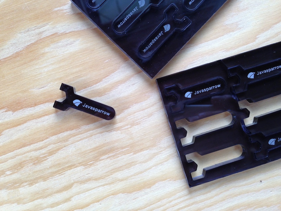 Javasparrowの扇風機は、ユーザ自身で組み立て・解体ができるDIY製品です。工具が必要なのは唯一1カ所でナットをしめるスパナだけですが、私たちはそのスパナも自作しています。レーザーカッタでアクリルの板をくりぬいてお届けします。