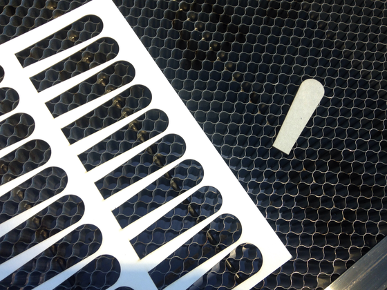 Javasparrowの扇風機に使われる羽根は、レーザーカッターで1枚1枚カットされています。羽根の材料は、白チップ11号と呼ばれ、表にマッドホワイトを施したボール紙です。回転する羽根に誤って触れてしまっても指を切らないように考慮しました。 羽根を設計するにあたり、2枚刃がいいのか3枚刃がいいのか、形状ははどんなものがいいのか、デザイン性や風量など調整に調整を重ね今の羽根になっています。 風量や静音具合は羽根のうねりなどが関係していると、既製品を調査してわかったのですが、羽根がボール紙の関係上、羽根にうねりをつけることが難しく、羽根を固定するパーツに工夫を凝らして現在に至ります。後日、これまでに試行錯誤した羽根のバリエーション等も紹介していきたいと思います。