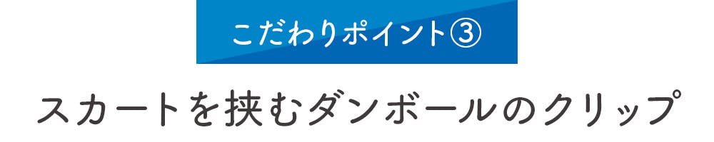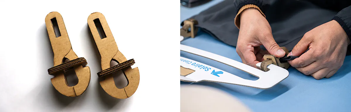 スカートを摘まむクリップもなんと段ボール製です。仕組みはシンプルですが、プロダクトとして実現するのは大変でした。