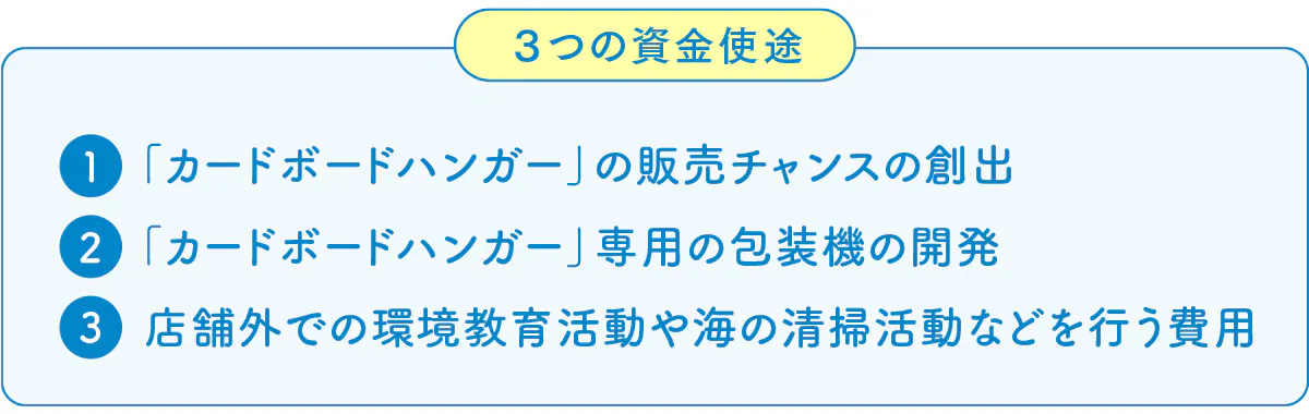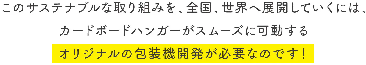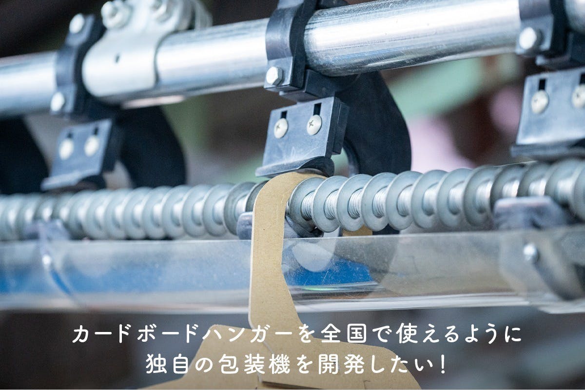 そのために、このプロジェクトを通して、まずは一人でも多くの方にこの取り組みを知っていただき「販売チャンスを創出」し、次に「カードボードハンガー専用の包装機の開発」をすることで、一気に業界・社会に普及を加速させたいと考えています。