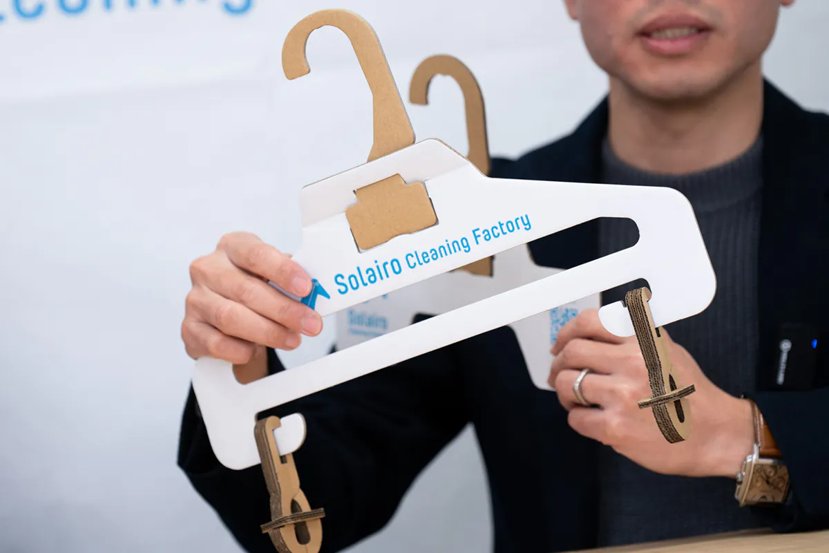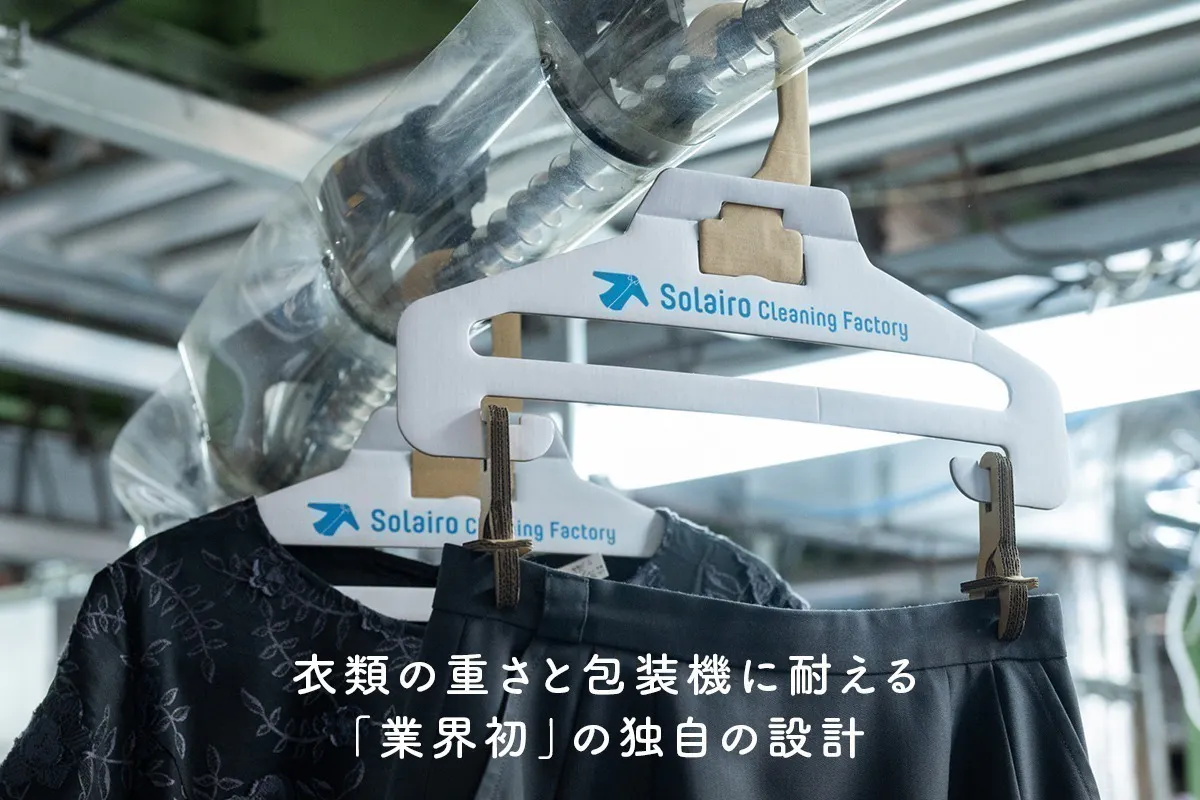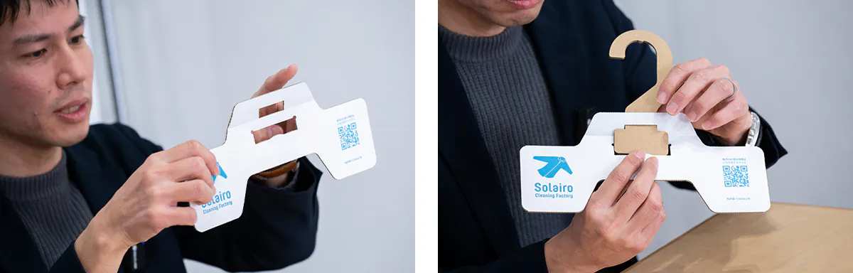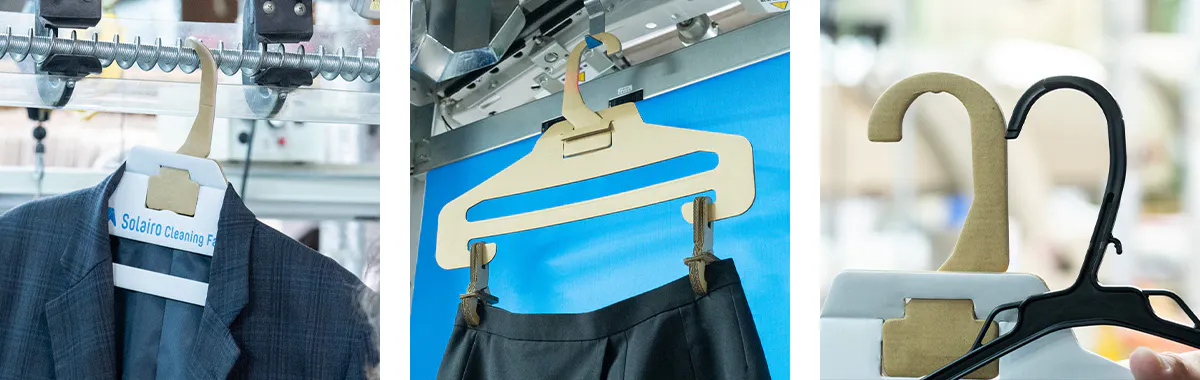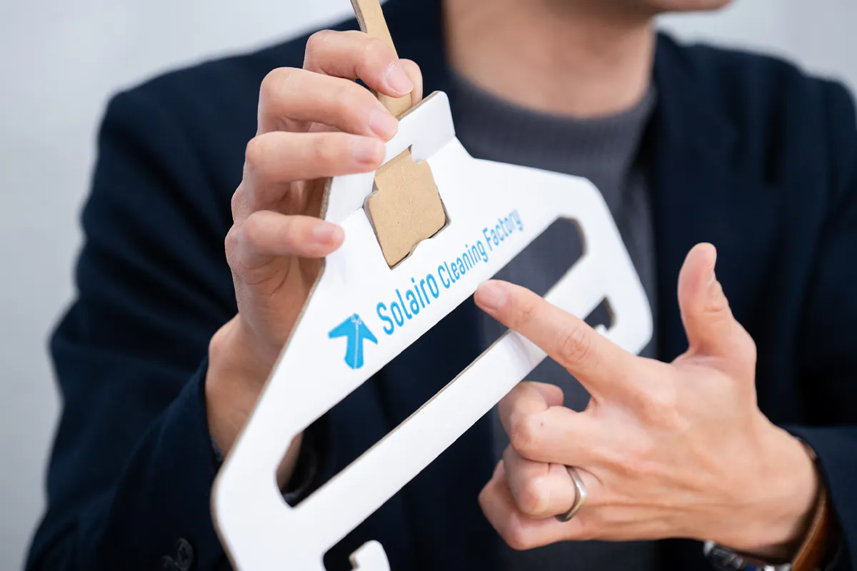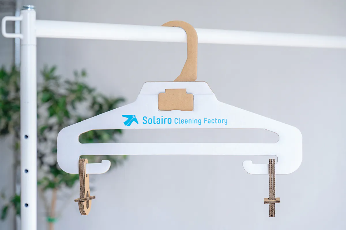 私たちは、2022年1月から段ボール会社(大国段ボール工業様)と共同開発をスタートし、まずは軽量タイプであるYシャツのクリーニング用の段ボール製ハンガーを2022年11月に完成させることに成功し、2023年4月からSolairoCFの4店舗での使用を実現しました。