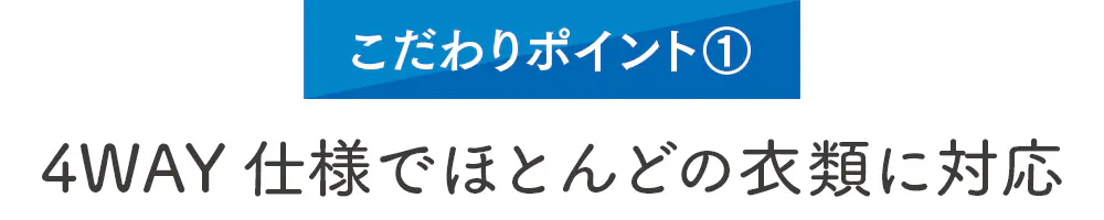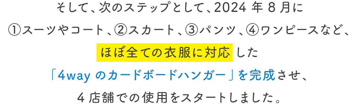 ①スーツやコート、②スカート、③パンツ、④ワンピースなど、重量(耐荷重2kg程度)や形において、ほぼ全ての衣服に対応しました。これによりSolairoCF4店舗におけるハンガーの脱プラが実現できました!