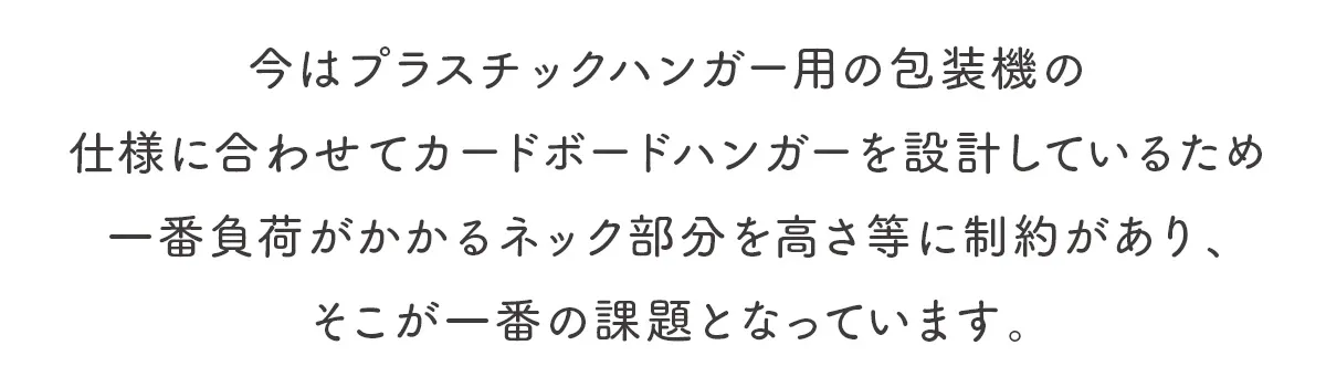 この段ボール製ハンガーは、既存のプラスチックハンガー専用の包装機等に合わせて開発されているため、まだまだ課題を抱えています。そのため、段ボール製ハンガー専用の機器類の開発を行うことで、業界への普及を促し、全国へ広めていくことを目指します。