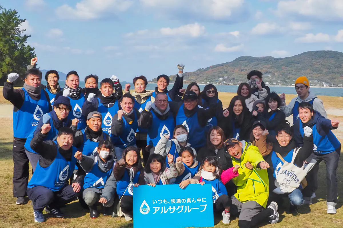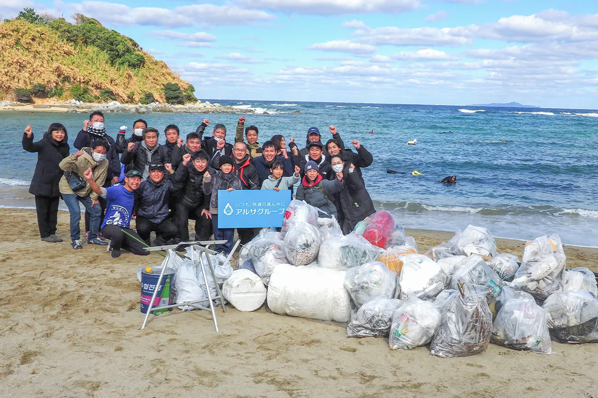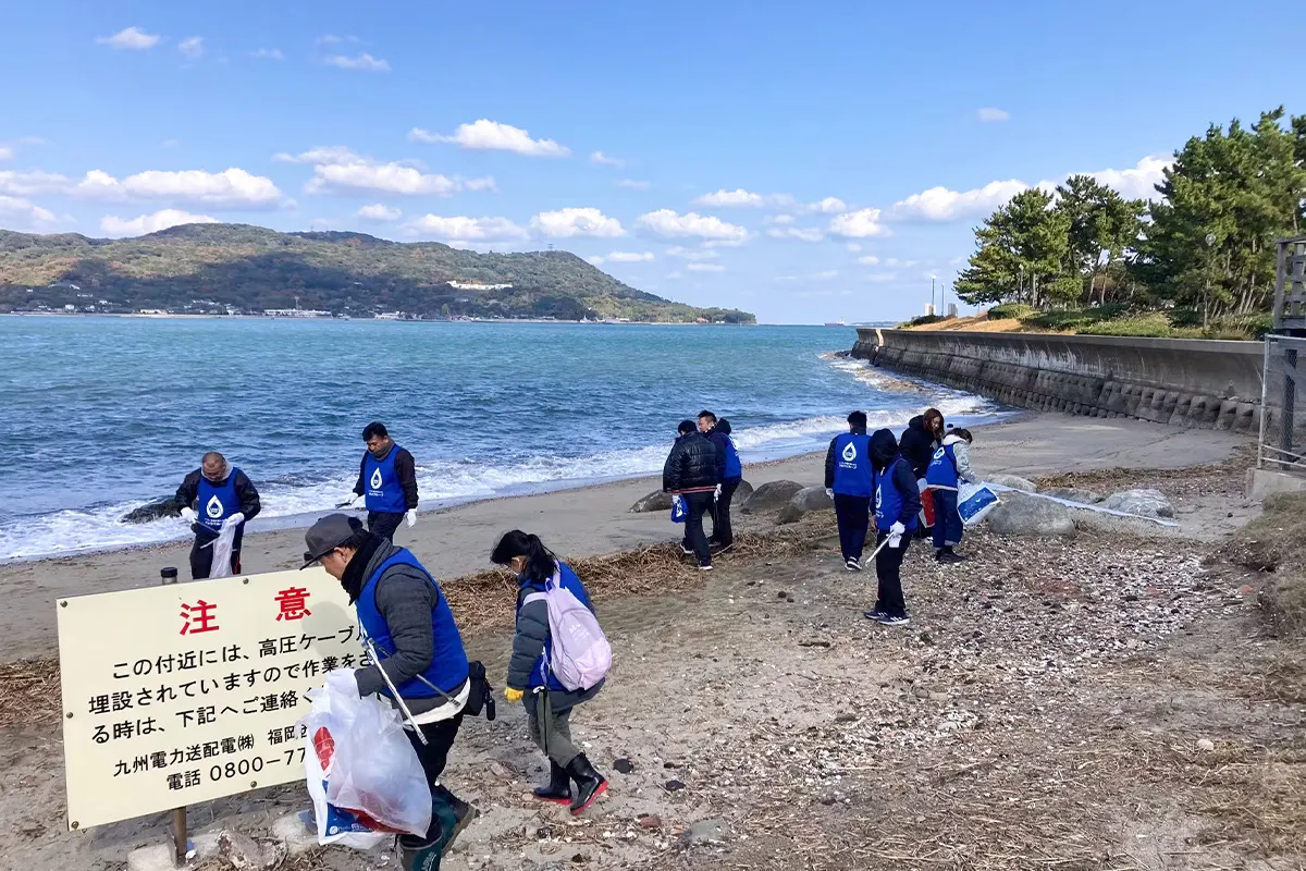 Solairoの洗剤やエコバッグの売上の一部を海洋保全団体である一般社団法人 ふくおかFUNへ寄付させていただくと同時に、博多湾岸のビーチクリーンアップや”海のゆりかご”とも言われる「アマモ」の定植活動を一緒に実施させていただいています。プラスチックゴミやペットボトル、空き缶などの海岸に漂着したゴミを分別しながら拾い集める清掃活動は、海の生態系を守ることに直結するため、とても大事な活動です。