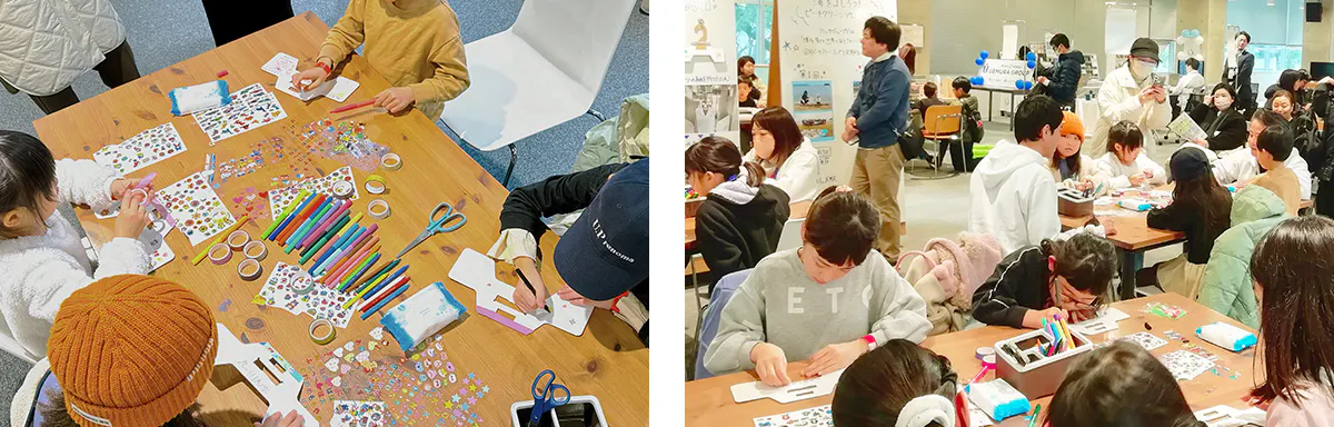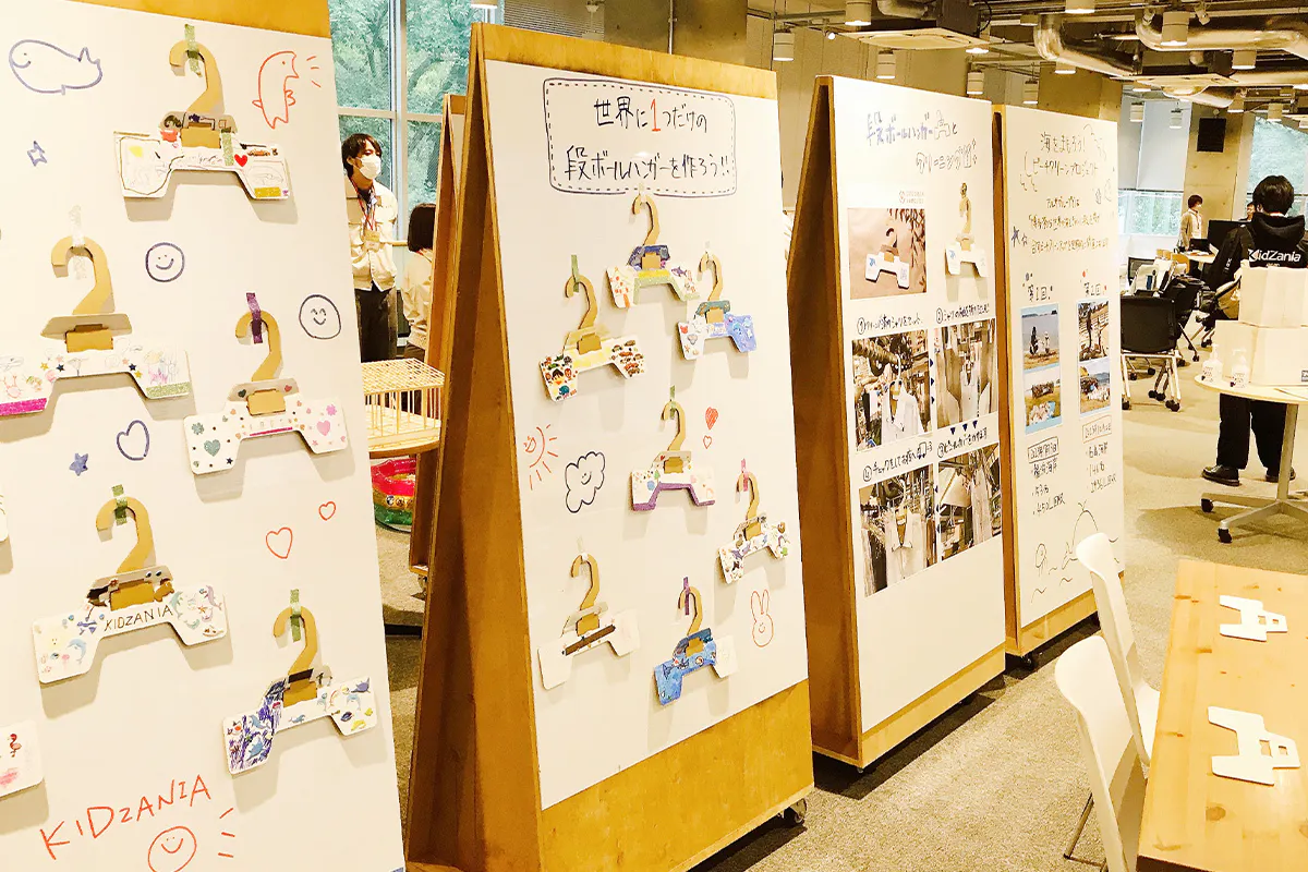 次世代を担う子どもたちの環境についての学びを支援すべく、地域で開催されるイベントなどへ積極的に参加しています。キッザニア福岡主催のワークショップでは、SDGsや環境への関心を育むプログラムとして、段ボールハンガーに自由にデコレーションする世界に一つだけのハンガーづくりを実施しました。