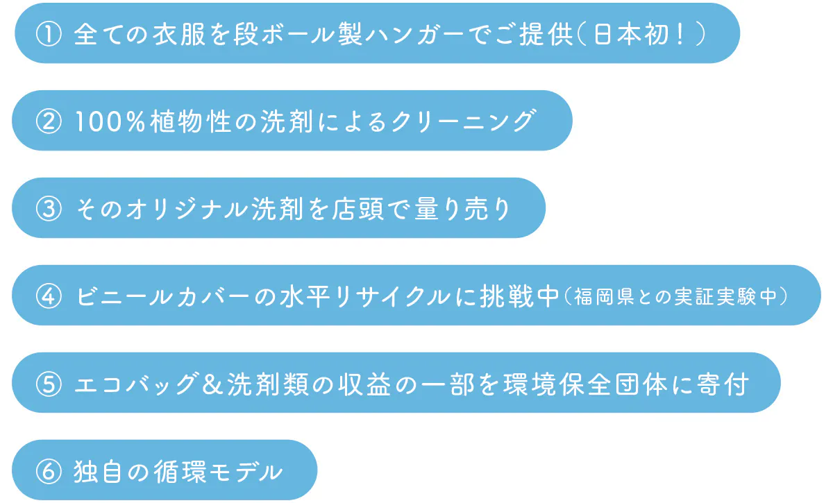 「ゼロ・ウェイスト&サステナブル」をコンセプトに「環境にも人にも衣類にもやさしい」クリーニングサービスを提供しています。「未来の子どもたちが安心して夢を追いかけられる環境を取り戻したい」という想いからスタートし、ゴミを極力出さない独自の循環モデルを構築し、業界を変革すべく様々なことに挑戦しています!