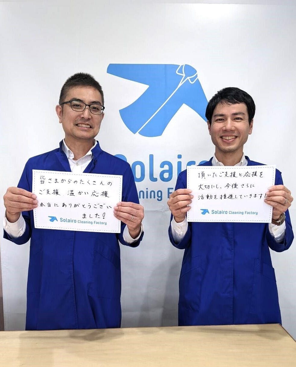 2025/03/30 07:173月28日をもちまして、【業界初!段ボール製「カードボードハンガー」で脱炭素社会の実現を加速させたい!】のクラウドファンディングは終了いたしました。おかげさまで、目標金額の70%を超える352,000円のご支援金をいただくことができました!ご協力いただいた皆さま、本当にありがとうございました。プロジェクトがスタートした時は低調な滑り出しだったため、とても心配しましたが、最後の1週間でぐんぐん伸びて70%に達しました。有難いことに、プロジェクトが終わってからもご支援を希望される声も頂きました。思い返せば、Solairo自体がコロナ真最中の2021年10月にスタートし、段ボールハンガーの開発は2022年2月からスタートしました。そこから1年でYシャツ用段ボールハンガー、2年でカードボードハンガーが完成しました。そして、グッドデザイン賞、福岡デザインアワード金賞等の受賞や、各種メディアでも取り上げていただくなど、反響はとても大きなものでした。とは言え、まだ当社の4店舗でしか使用していないため、環境インパクトは限定的です。これをいかに広めていくかを考える中で、クラウドファンディングに挑戦することになりました。そして、今回のクラウドファンディングを始めたところ、全国からご支援と温かいお言葉の数々を頂き、本当に励まされました。本当に嬉しかったです。ありがとうございました。私たちの取り組みの意味を分かってくださる方々が全国にいらっしゃるという勇気も頂きました。↑の写真の手書きのメッセージにもありますが、これらのご支援金、お言葉を大切にして、今後ますます活動をスピード感を持って邁進してまいりたいと思いますので、今後とも引き続きこの取り組みを応援いただければ幸いです。また、改めて活動をご報告できればと思いますが、まずは活動報告を持ちましてお礼を申し上げます。この度は、本当にありがとうございました。Solairo Cleaning Factory 毛利明光&松本岳志 もっと見る