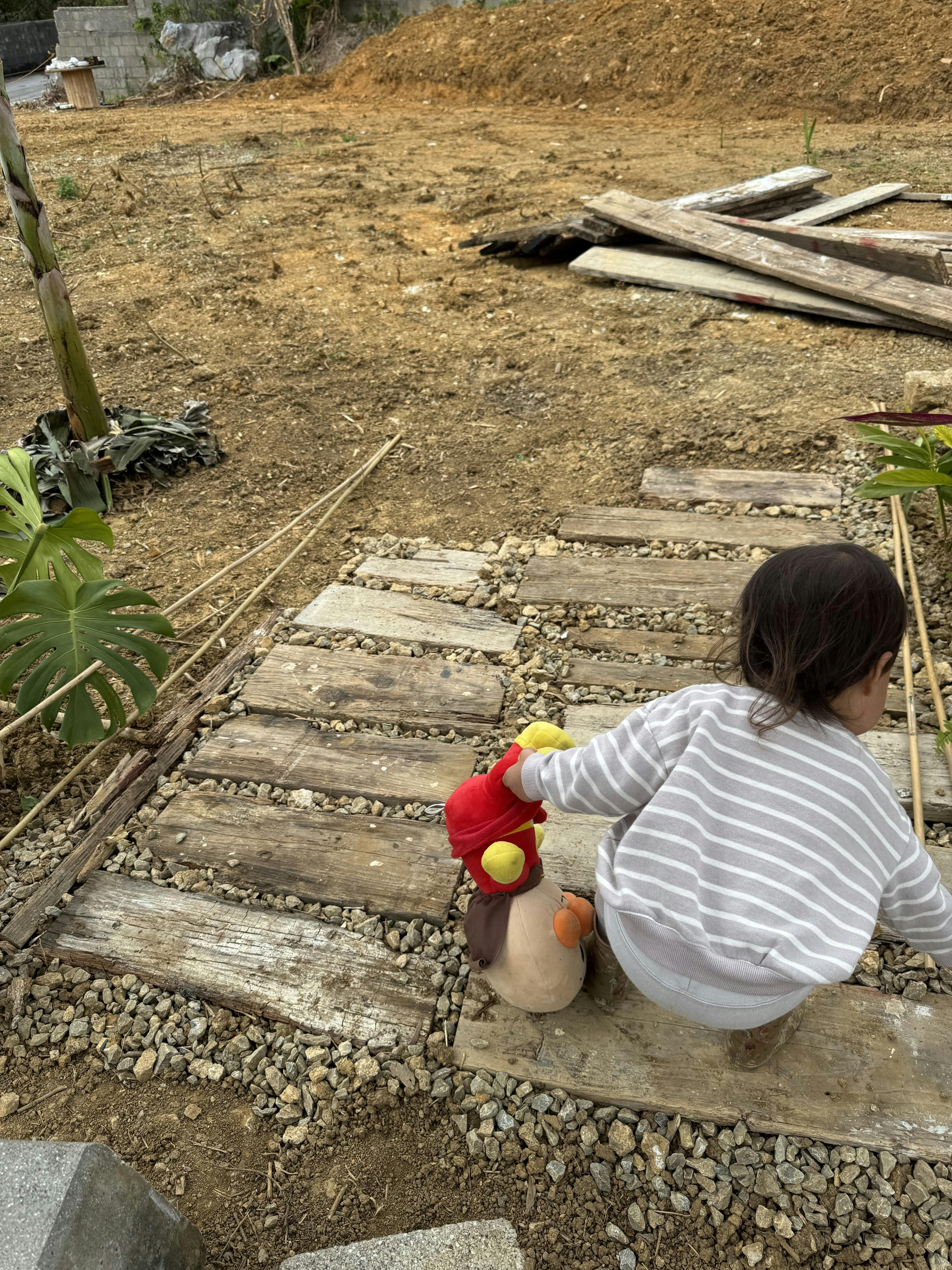 土建業者さんとご縁があり、廃材を活用し散歩道を。そしと農園内にはたくさんの小石が含む土壌のため畑にするにも1つづつ石をできるだけ取り除いています。が、気の遠くなるような作業です(笑)