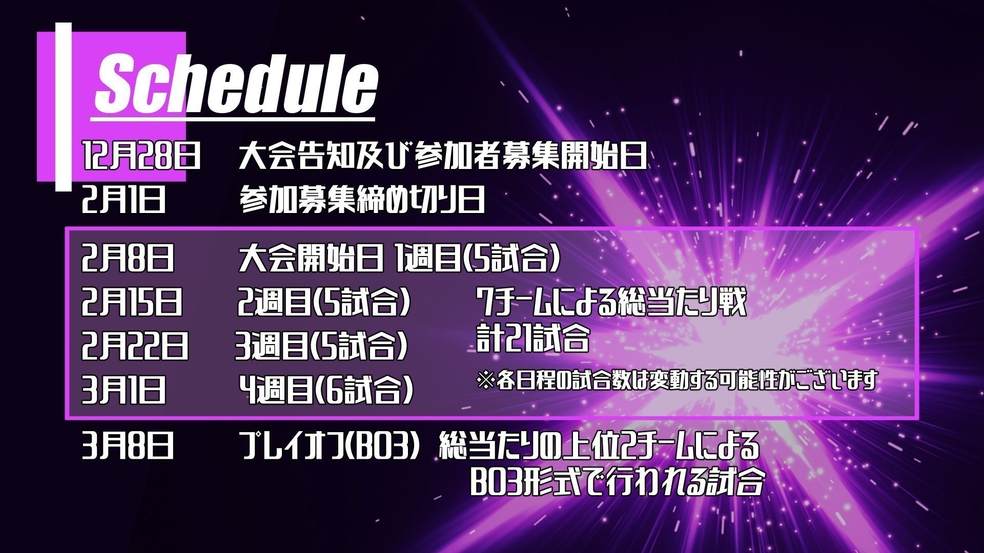 そこで私たちは、長期的なリーグ大会を開催することで、競技シーン全体を育て、プレイヤー同士が切磋琢磨しながら成長できる場を作ることを目指すことにしました。このリーグが、オメガストライカーズの競技シーンを確立する第一歩となり、プレイヤーやコミュニティにとって新たな価値を提供するものになると信じています。