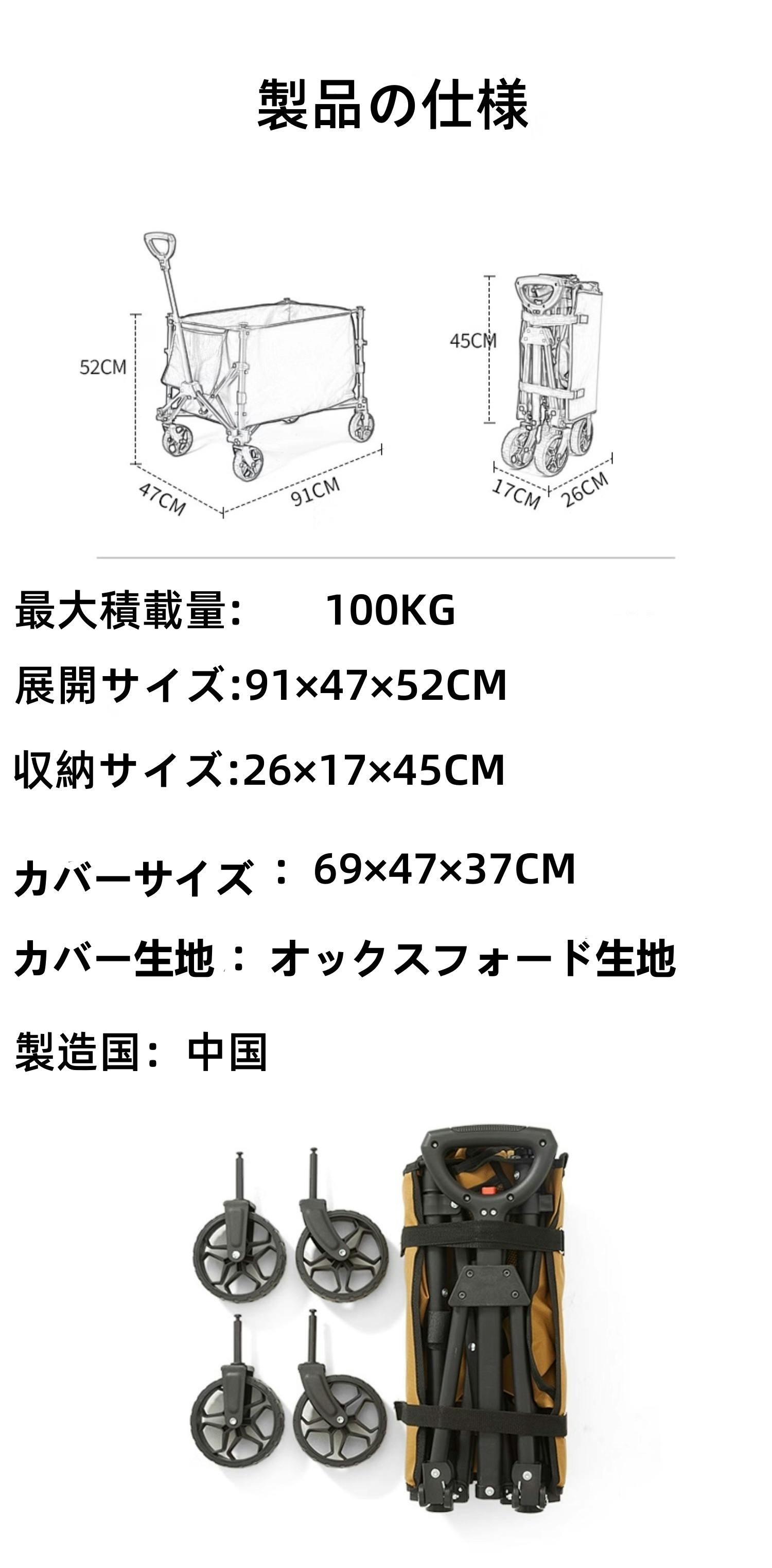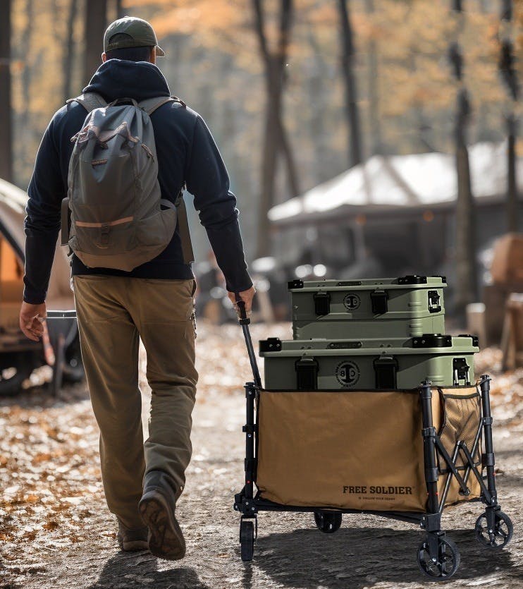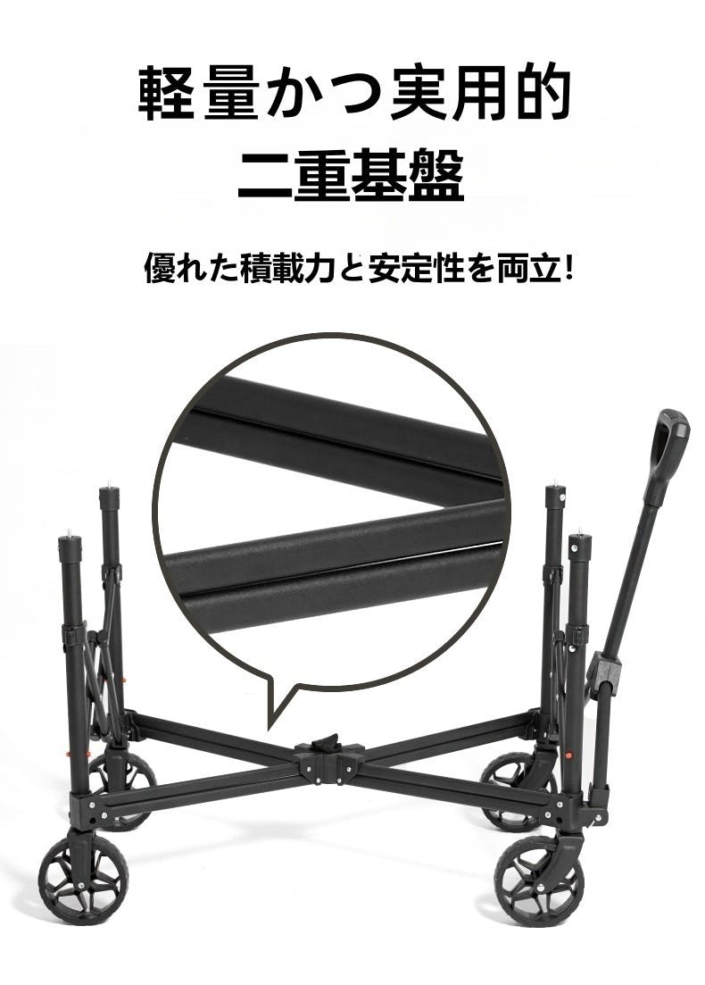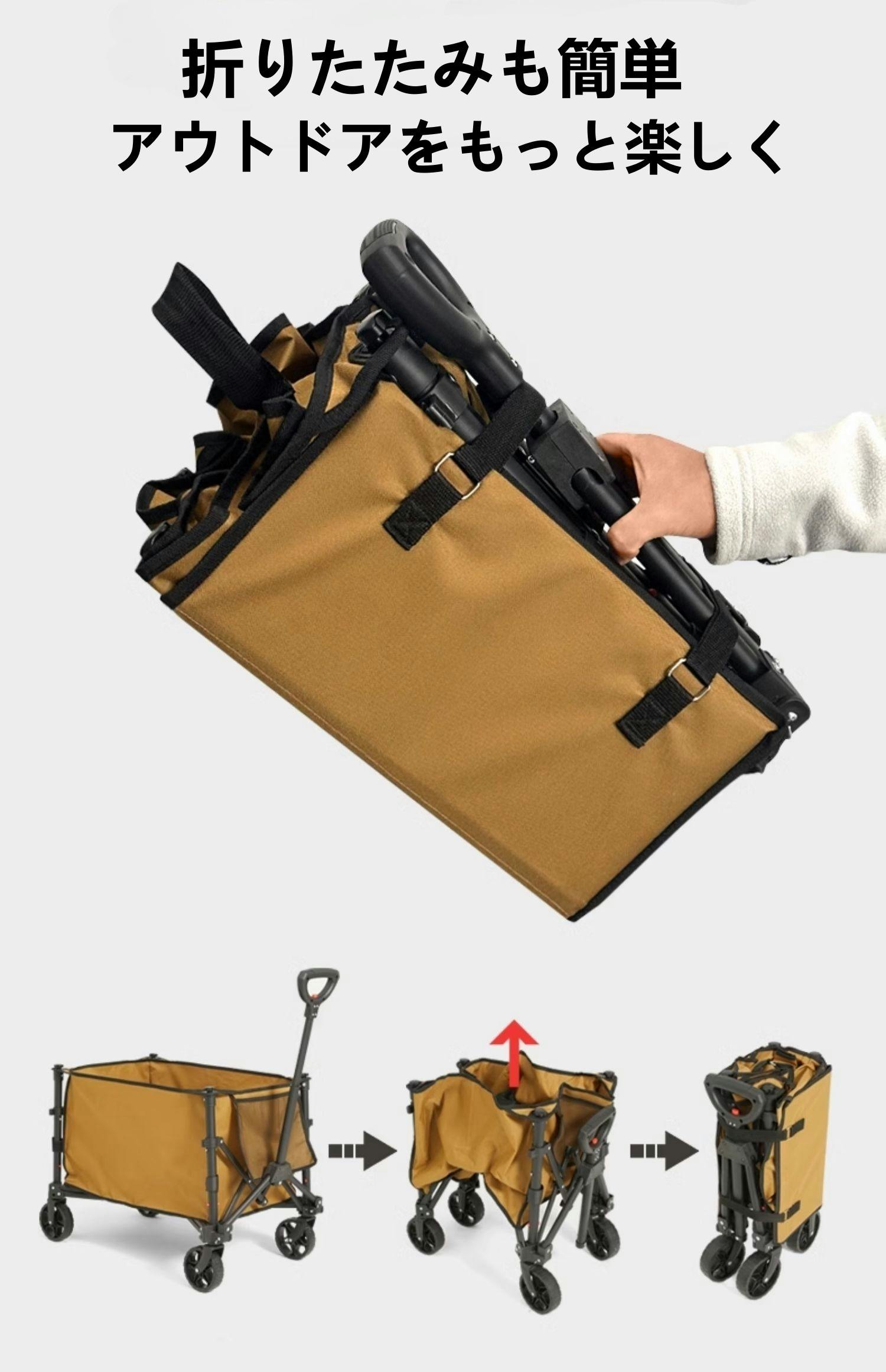 このカートは携帯性に優れ、キャンプ用品や飲料などを楽に運べます。使用後は簡単に折りたたんで、スーツケースや車のトランクに収納可能。耐久性の高い素材と工夫されたタイヤ設計により、山道や砂地などの悪路でもスムーズに移動できます。