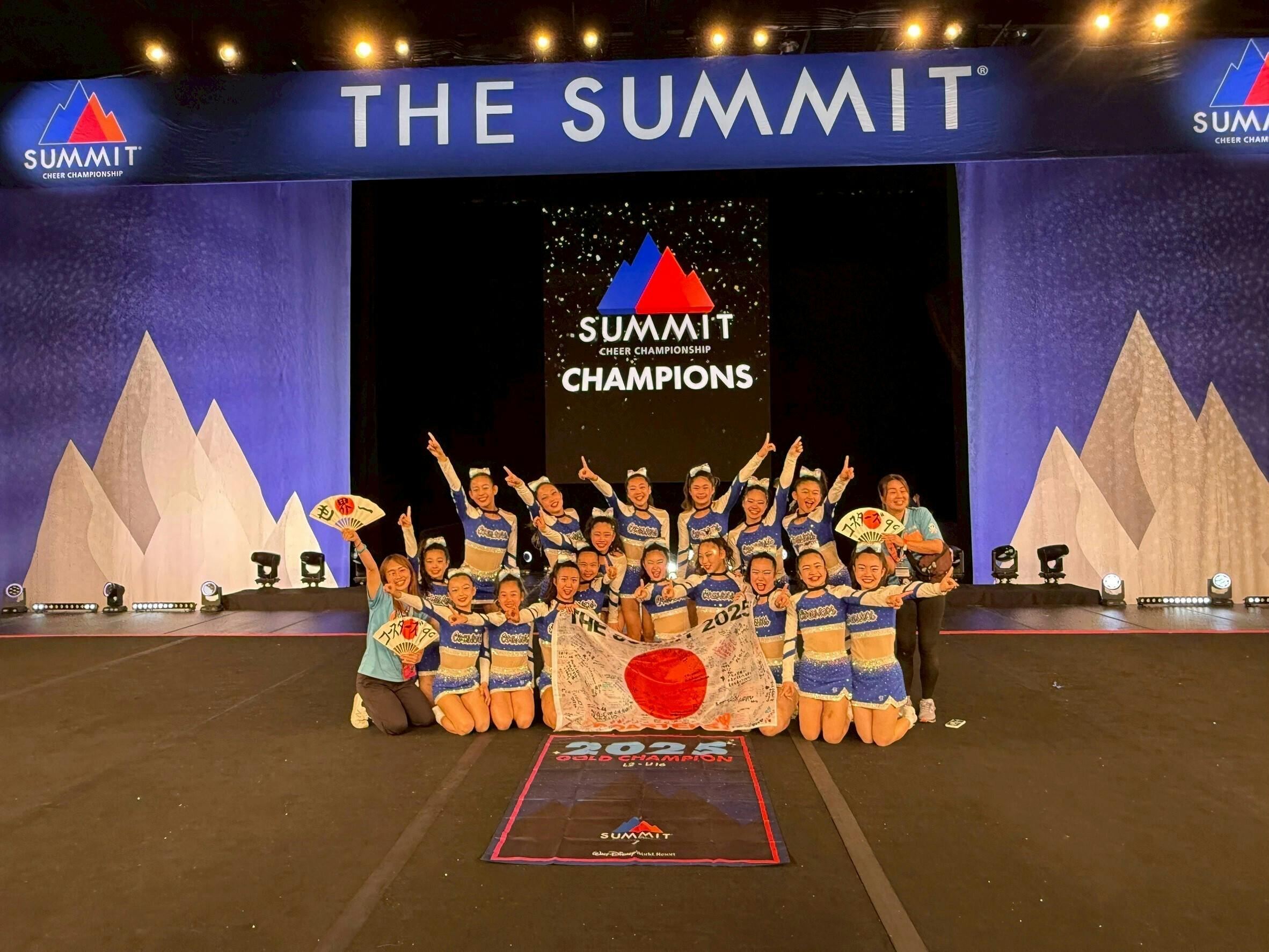 2025/05/04 01:13ご支援くださった皆様へ世界大会The Summit 2025のご報告です。【結果】セミファイナル1位通過ファイナル1位で優勝することができました!また出場全チーム【総合10位】という快挙を成し遂げることができました。皆様からのあたたかいご支援、ご声援やメッセージをいただき本当に力になりました。4月29日に出発し羽田空港で4時間遅延、ミネアポリスで乗り継ぎ時間が少なくみんなでダッシュをするハプニングがありましたが体調を崩したり怪我をすることもなく17人全員で夢の舞台に立つことができました。違った環境に動じることなく、自分たちのベストを出そうと最後の最後まで尽くす姿は頼もしく感じました。Good Luck!やGood Job!とたくさんの声をかけてもらい本場のチアリーダースピリットに触れることができました。現地に来てくれた家族や日本から応援してくださった皆様のおかげで''優勝''という結果をいただくことができ、本当に嬉しく思います。今日は1日だけの自由行動日で、最後は子供らしく楽しんでほしいなと思っています。帰国したらまたゆっくりとご挨拶させていただきます。本当にありがとうございました。 もっと見るプロジェクトが終了しました【お礼】