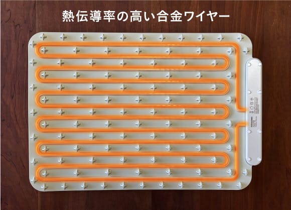 【電熱ランチョンとろ火マットミニ】は熱源に熱伝導率の高い合金を使用し底面に張りめぐらせています。