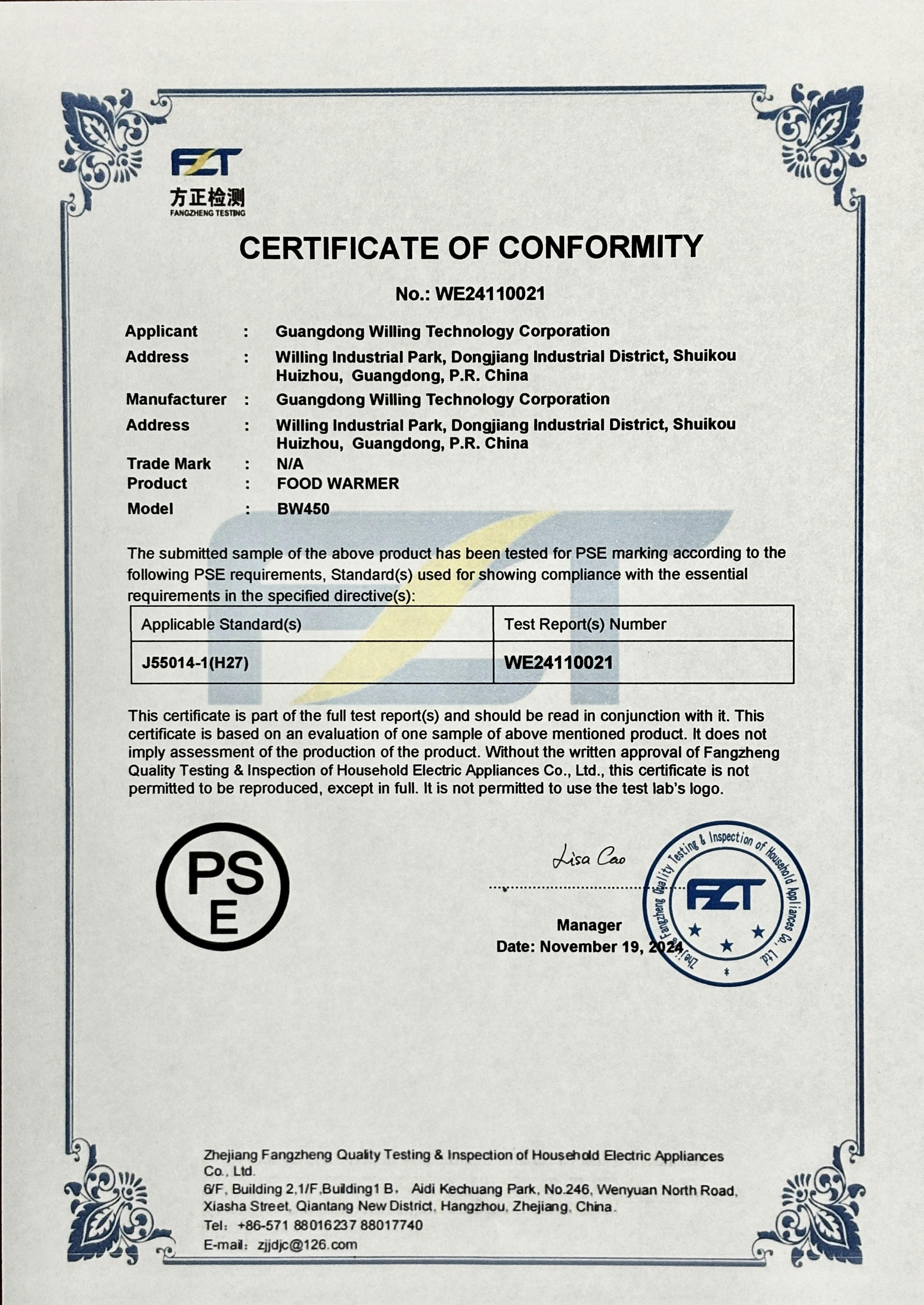 【フードウォーマーBW450 PSE認証証明書】