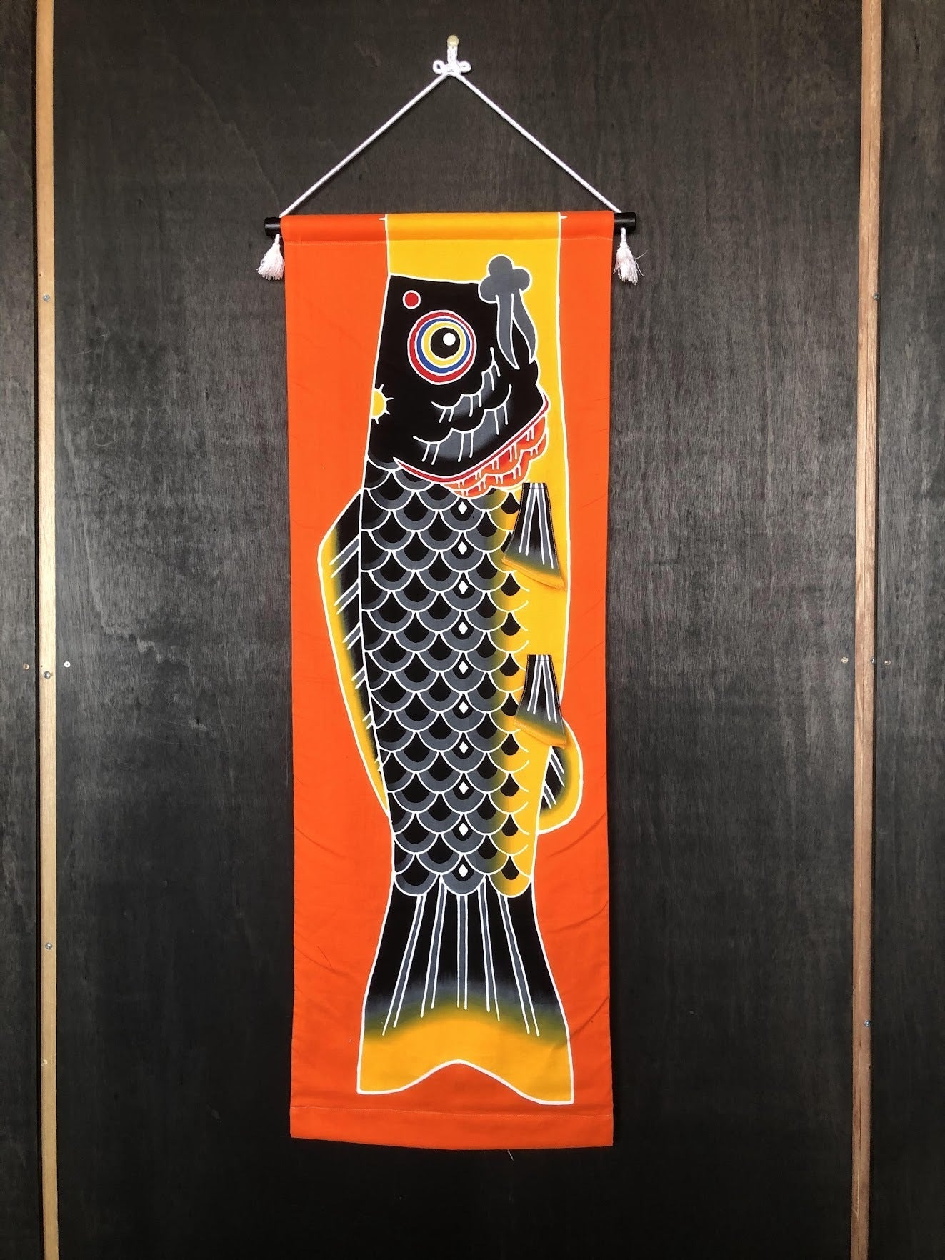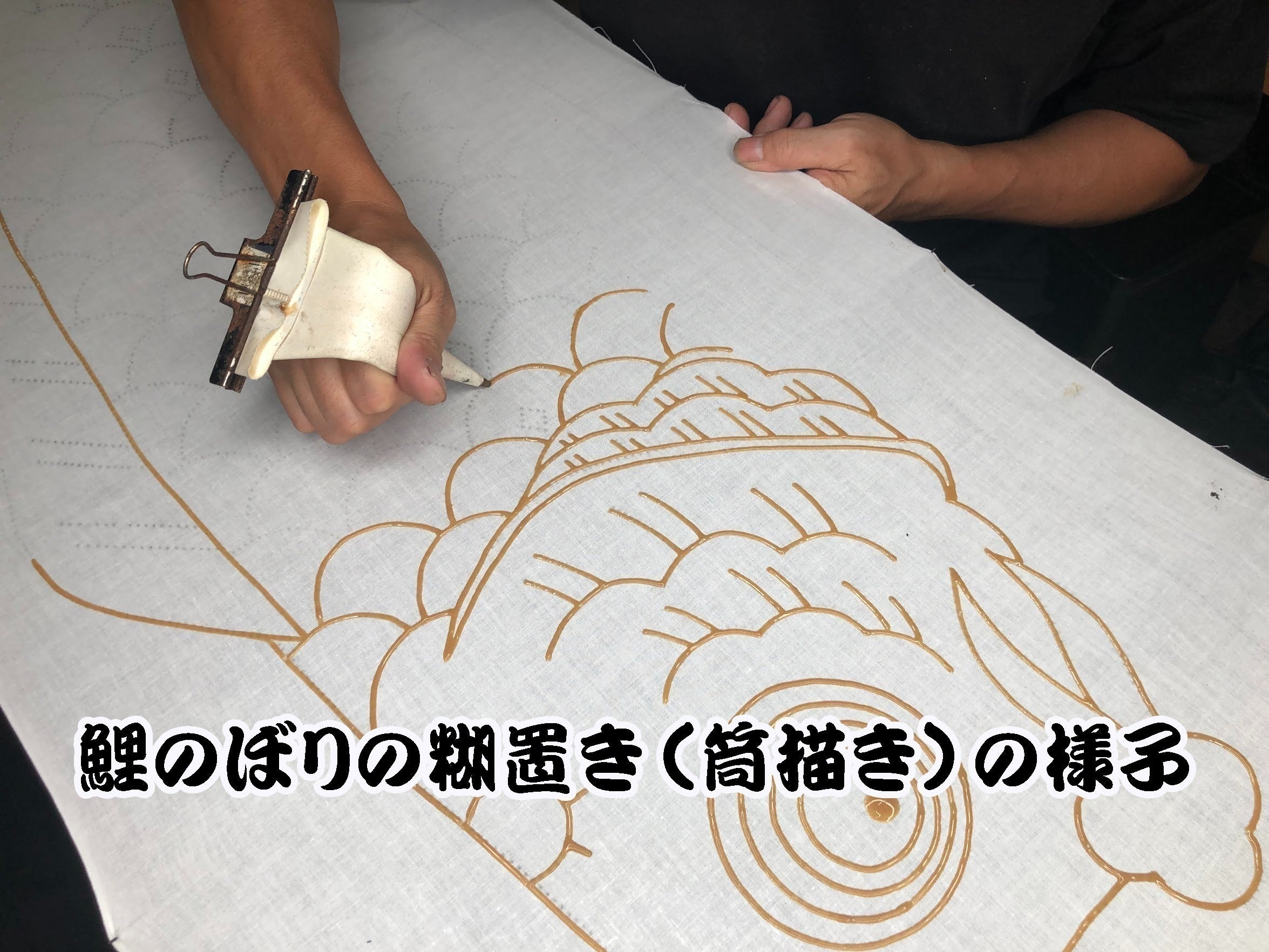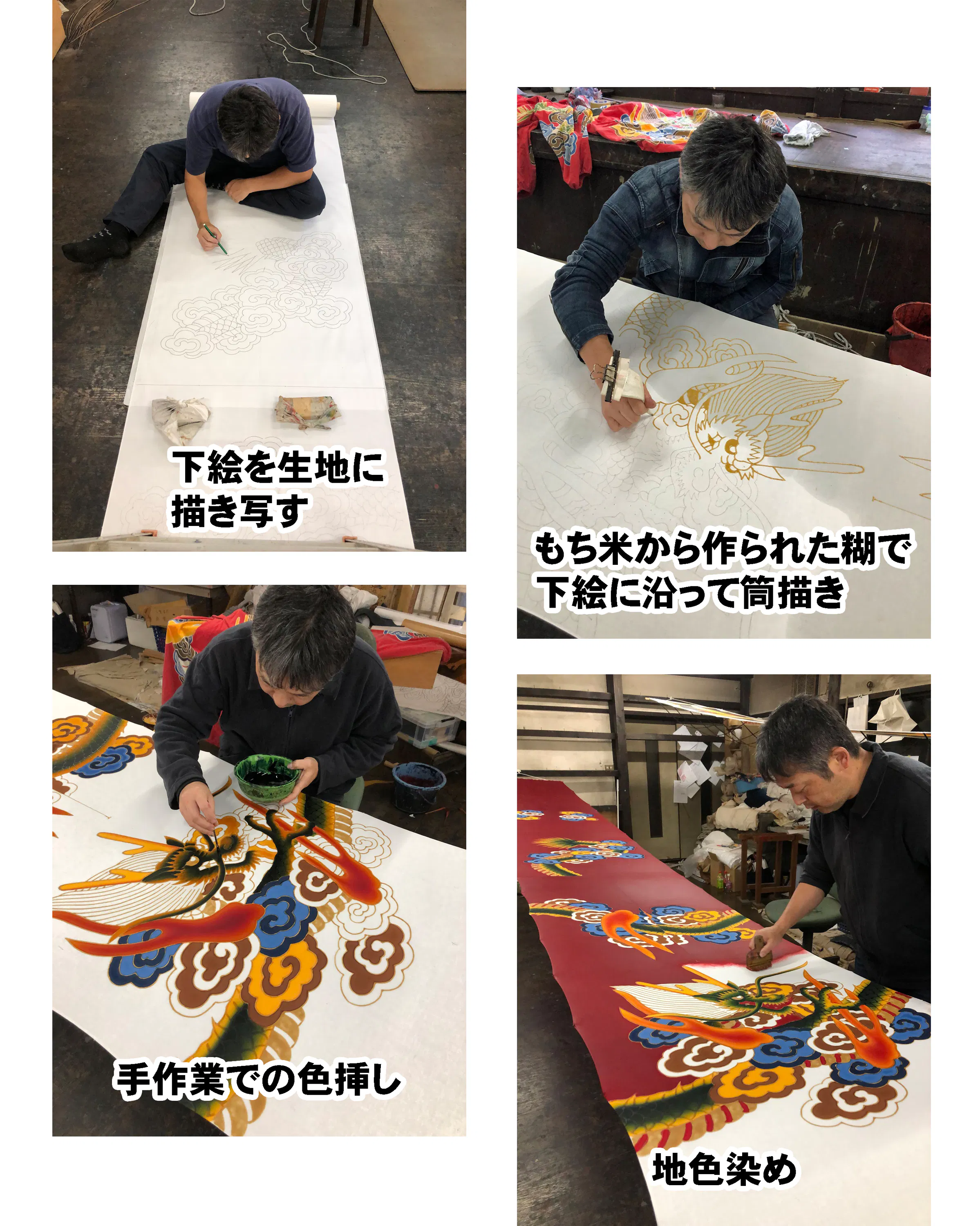 日本の伝統的染色技法とは、もち米と米ぬかを練って作った糊を使って模様の線を描き、一色一色刷毛や筆を用いて色を染め付けていく技法を言い、近年は、プリントなどでお手軽に製作することもできますが、どうしても機械製造の無機質な印象は残ります。それに比べて、手作りの動きのある暖かさは何物にも代えられません。