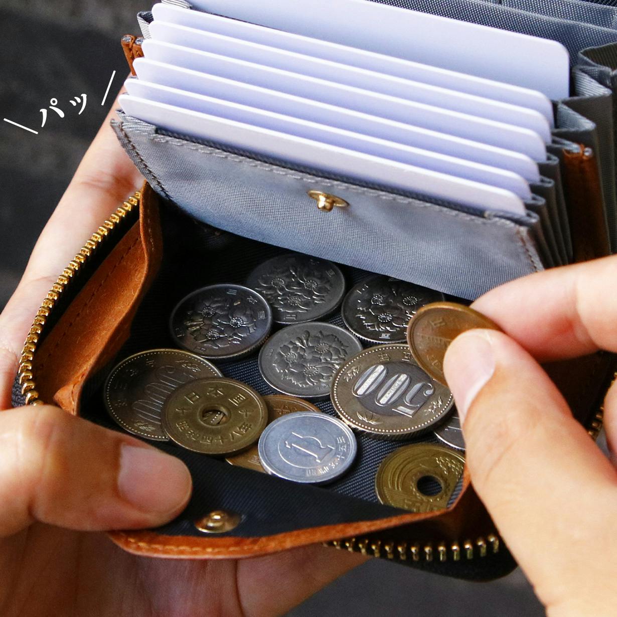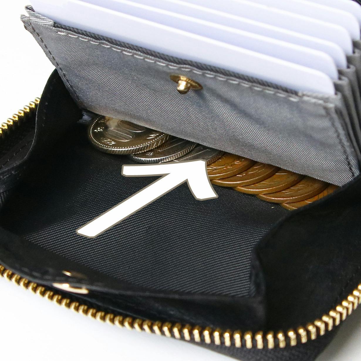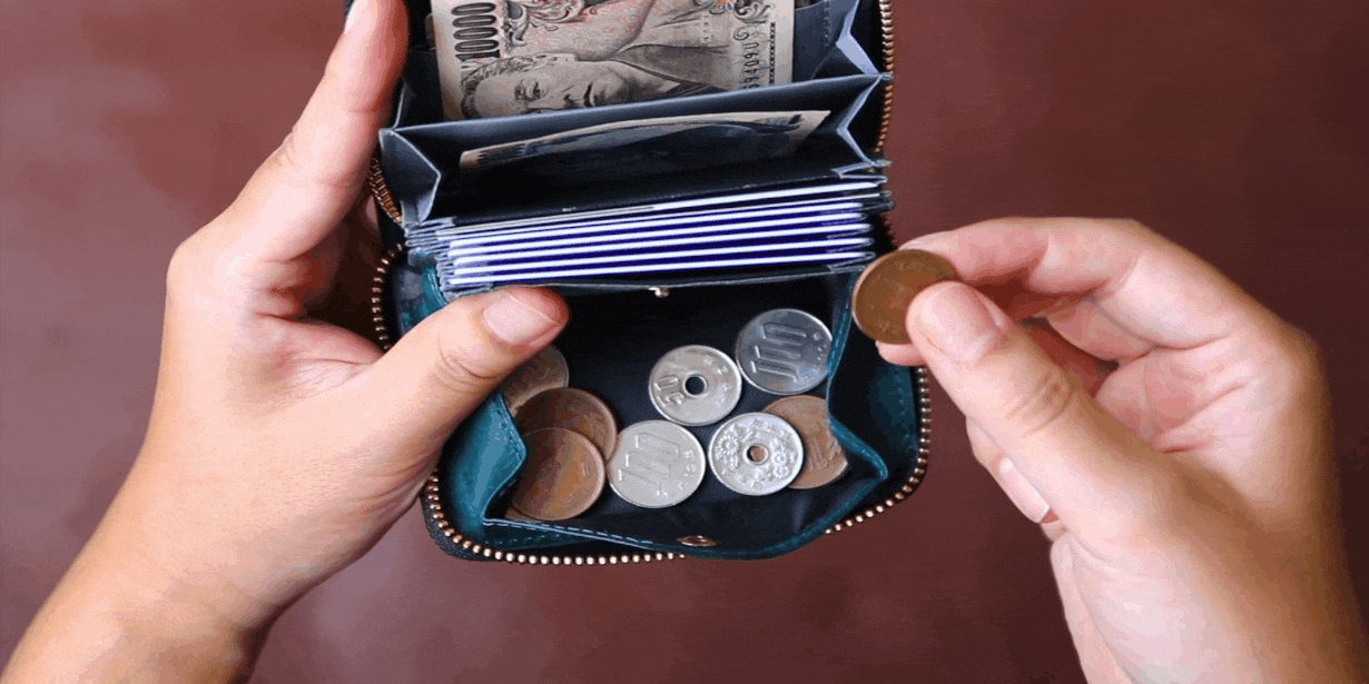 その結果、財布を閉じると硬貨は滞留せず自然と底に貯まる仕組みとなっています。