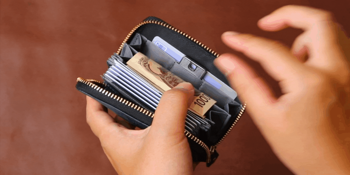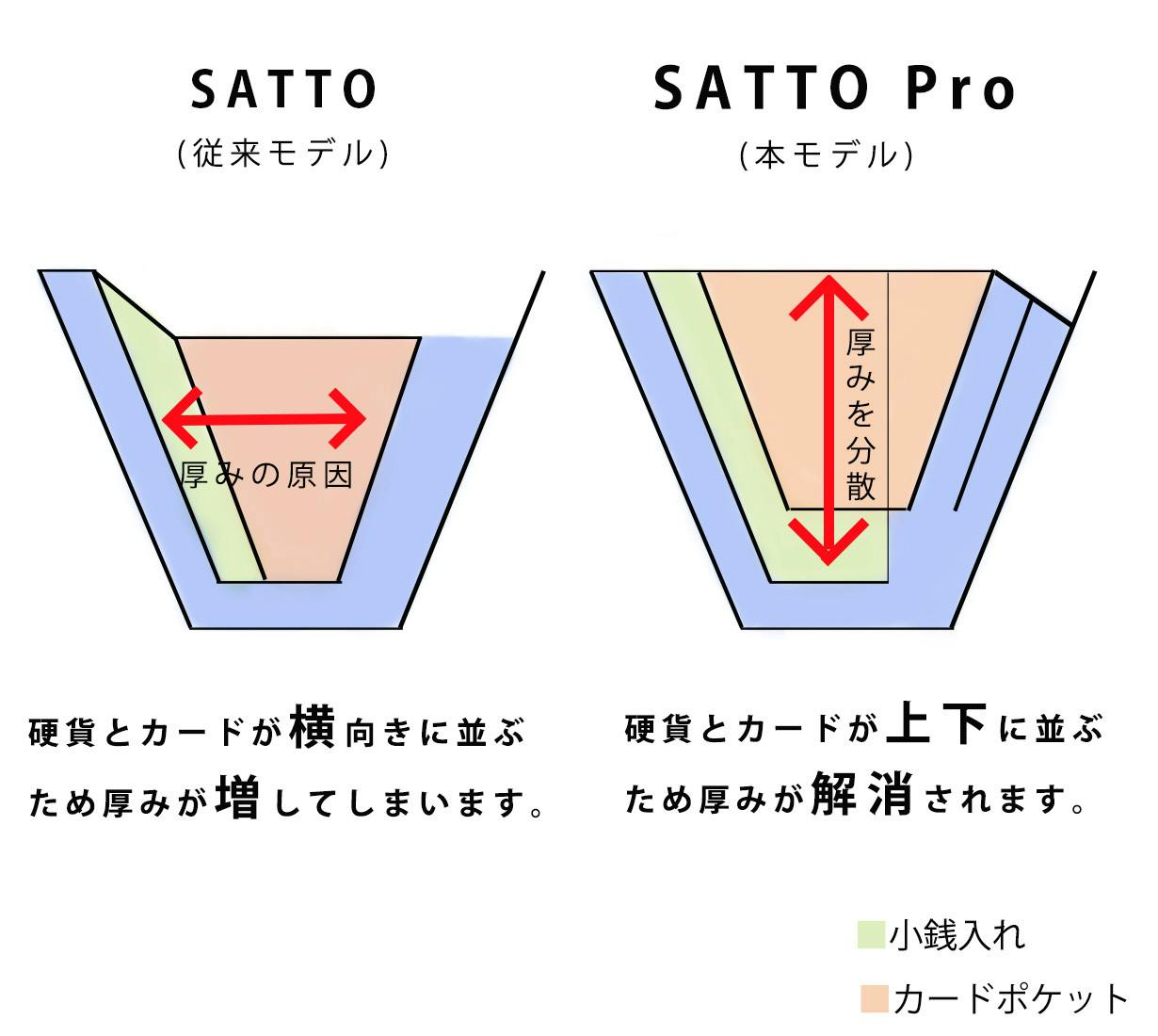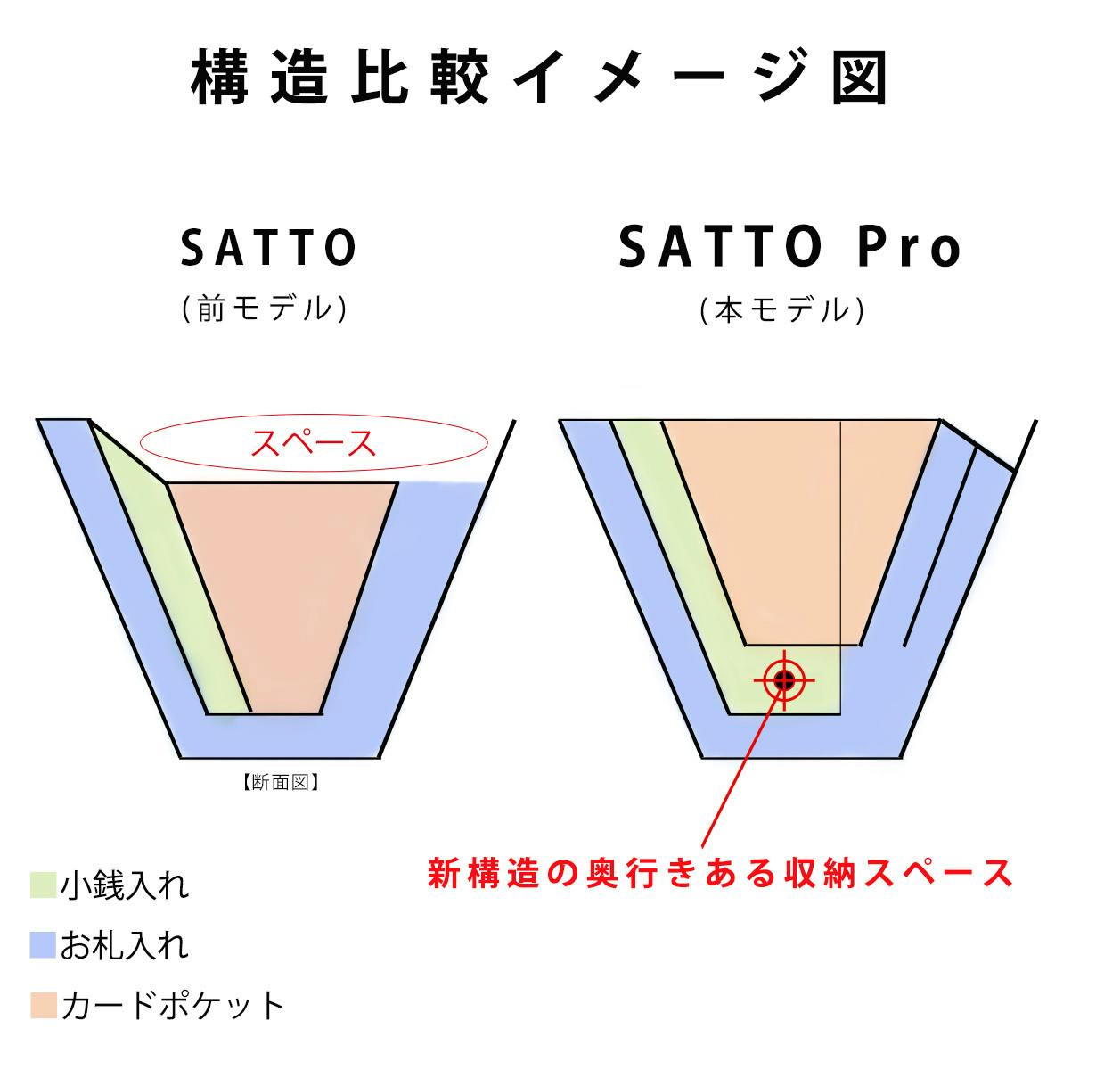 従来モデルではカードと硬貨が横に並び、それが厚みを生み出す原因となっていましたが、SATTO Proは新構造によって硬貨が底に収まるため、カードと重なることなく、膨らみを極限まで抑えることが出来ます。