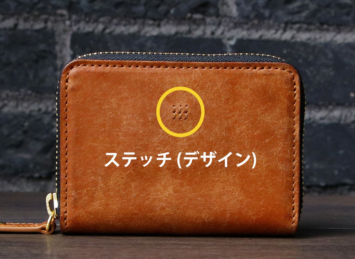 単にホックを付けただけではなく、ホックを【閉じる動作】すらも簡潔にしました。「小銭入れを閉じる」「財布を閉じる」。本来あるそれぞれの【閉じる動作】を、1つに一連の流れにすることで時短と利便性を向上しています。そしてそれを可能にするのがこのステッチです↓