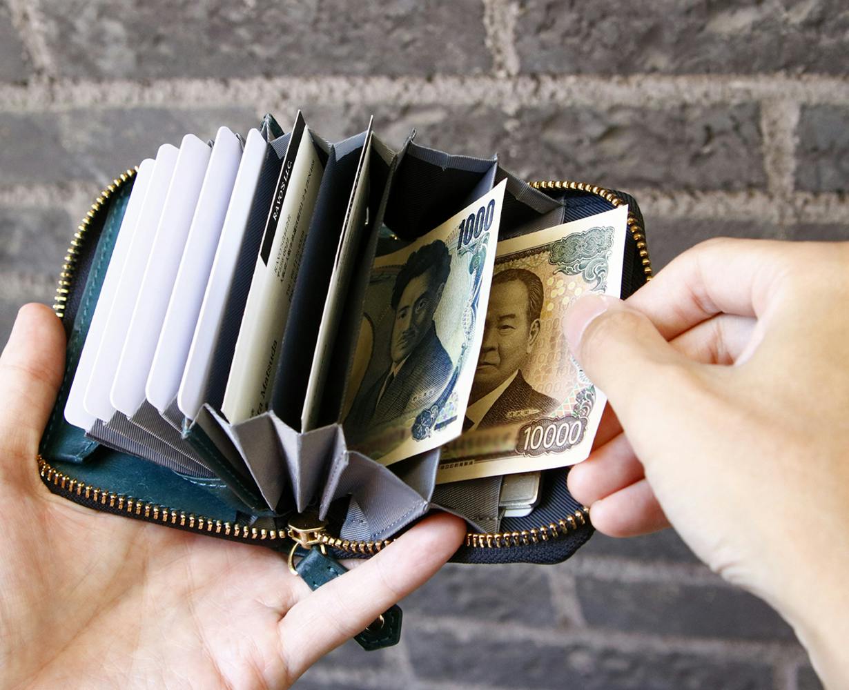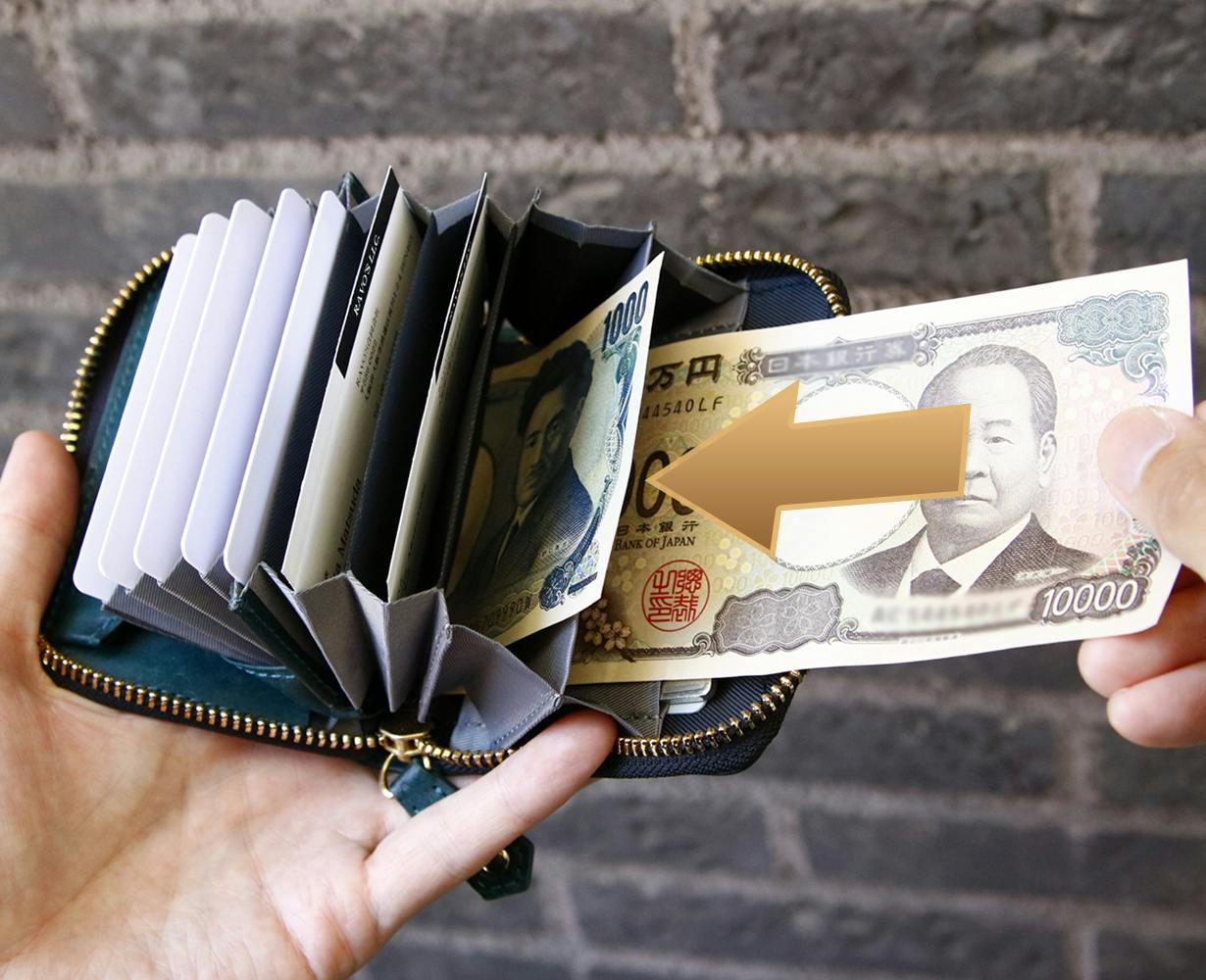 ミニ財布でも万札や領収書の収納は必須。千円札と万札などそれぞれ綺麗に仕分けができるスペースをデザイン。開いた時の見た目も整理整頓にも◎