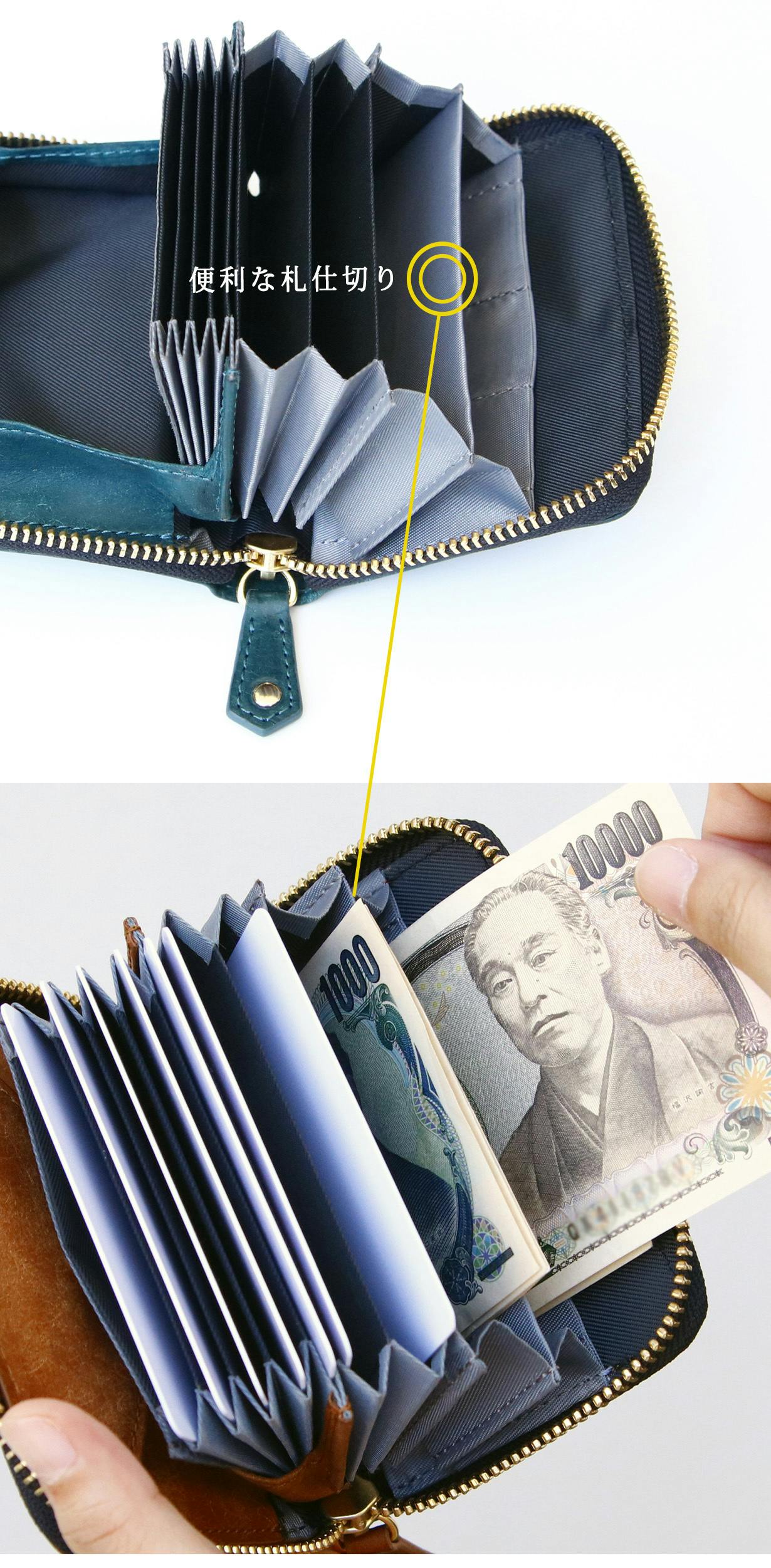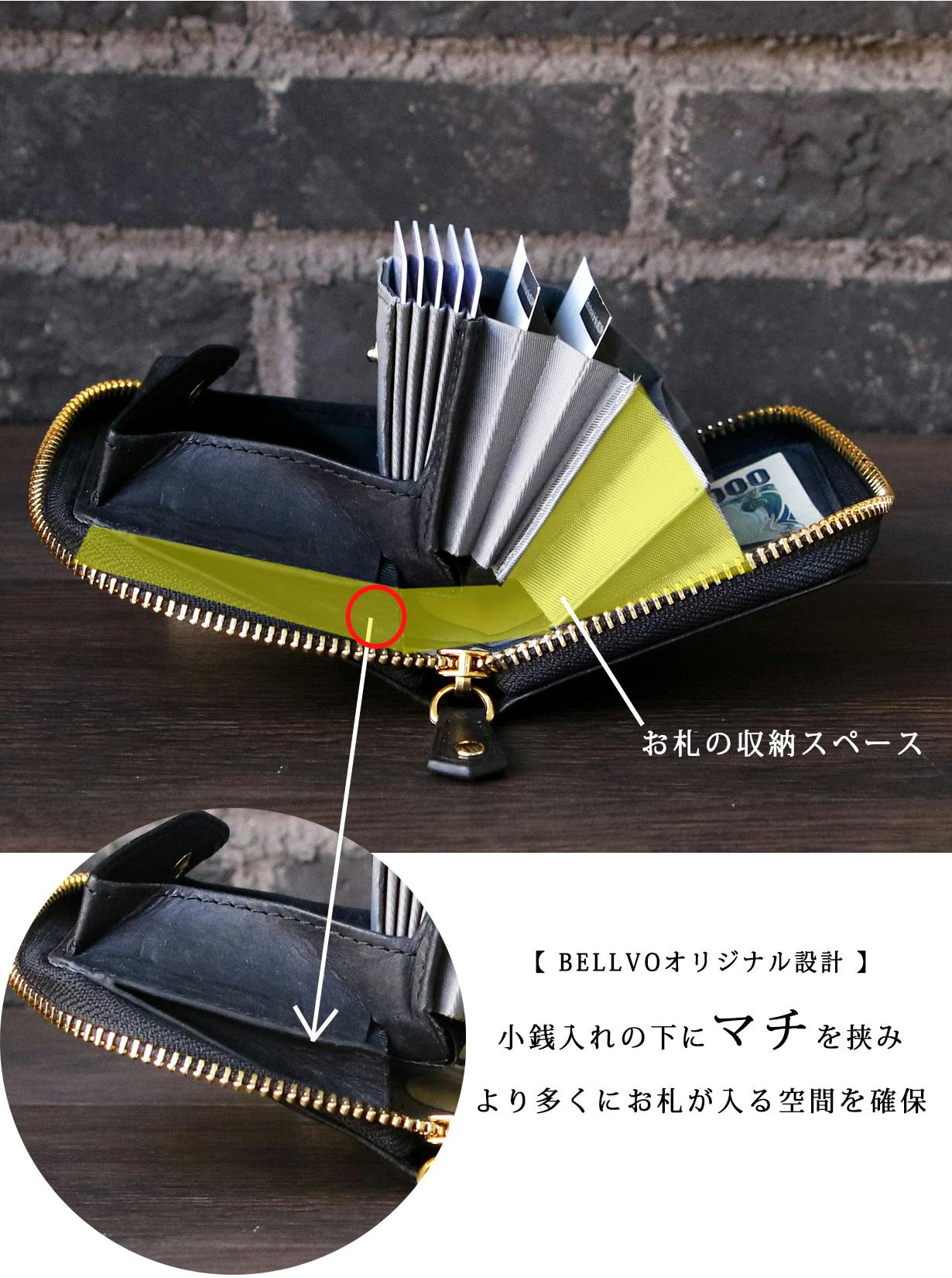 カードポケットと小銭入れの下に空間を作ることでお札の収納スペースをしっかりと確保。そして小銭入れの下部には「マチ」が設計されているので、15枚以上の紙幣も問題なくスムーズに収納できます。