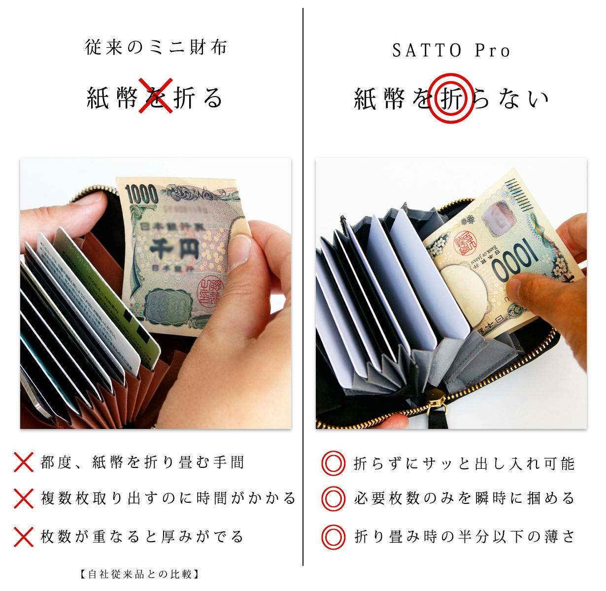 SATTOシリーズの魅力はミニ財布ではありえないほどの圧倒的な収納量ですが、Proは収納量はそのまま限界サイズまで薄く仕上げる事にこだわりました。