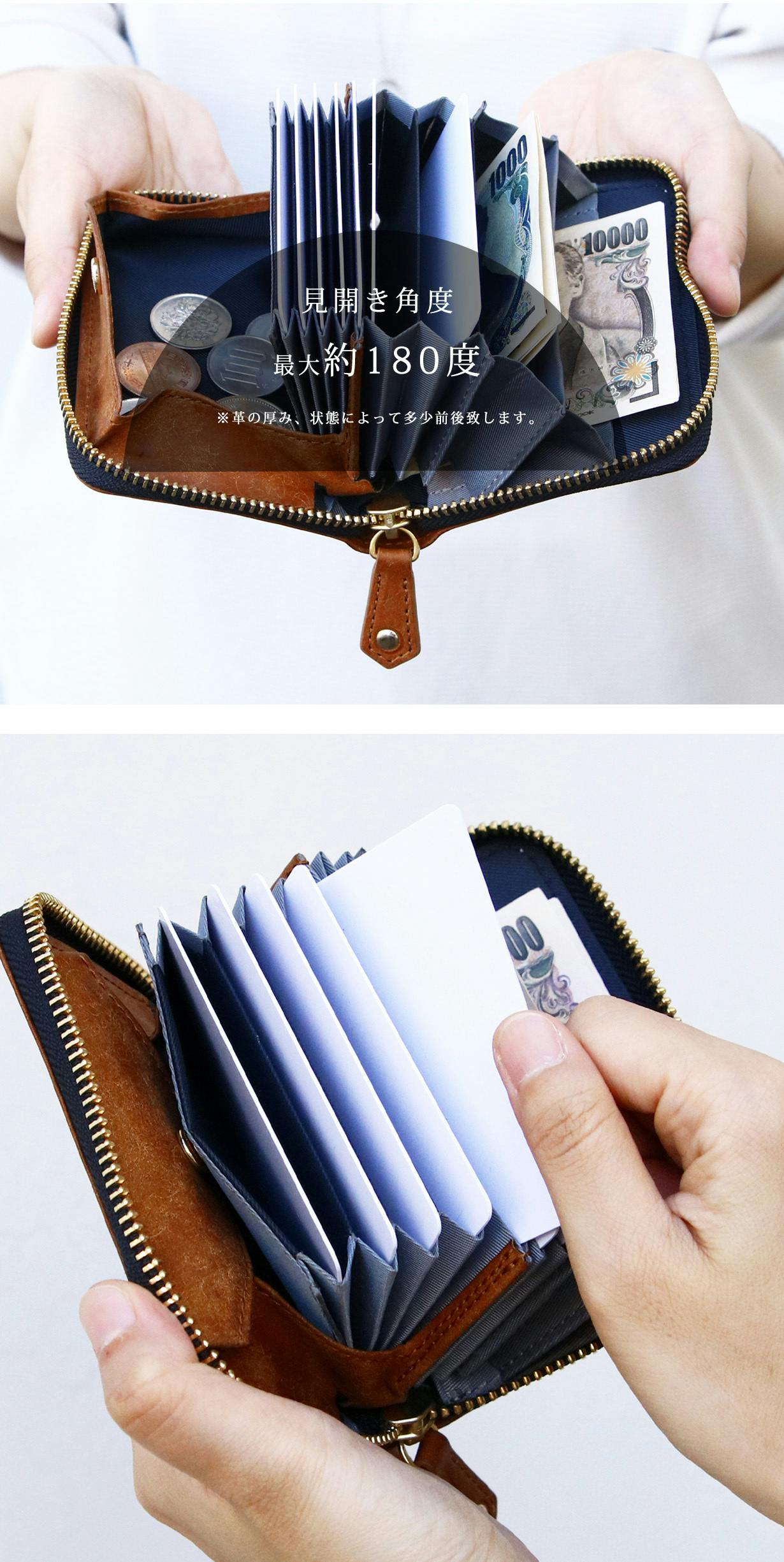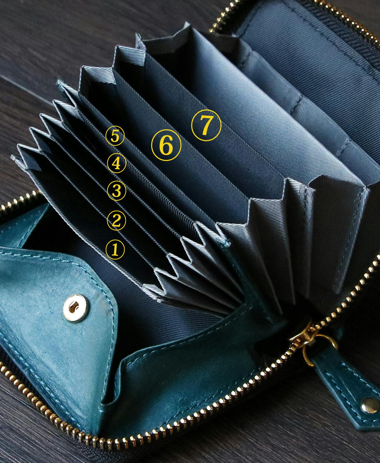 【仕 様】蛇腹カードポケット×7、ICカードポケット×1、BOX型小銭入れ、札入れスペース×2、鍵ポケット×3、スキミング防止機能付き