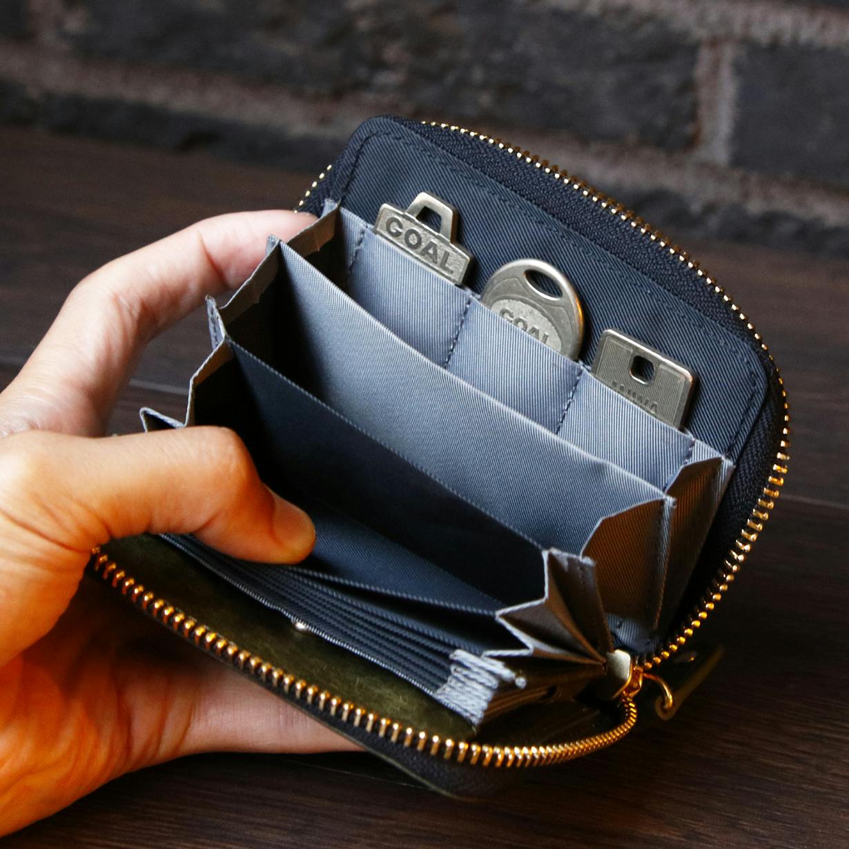また、キーポケットの位置を端にすることで、ファスナーやお札の収納動線に干渉しないので、背の高いカギも収納することが可能となりました。