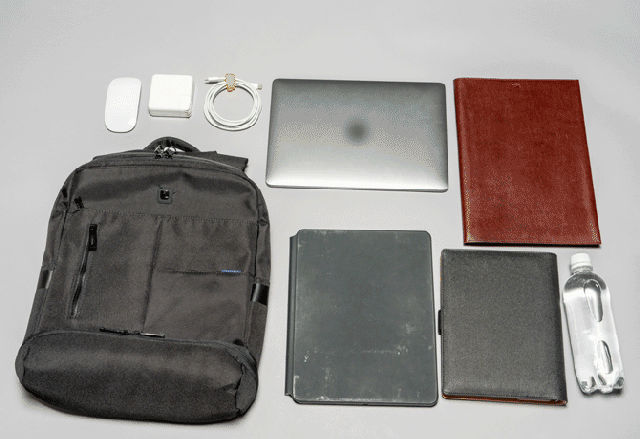 薄いからといって、荷物が入らないわけではありません。例えば、PC、タブレット、A4ノート、手帳、500mlのペットボトル、マウス、アダプター、ケーブルを入れても薄さをキープし持ち運ぶことが可能です。