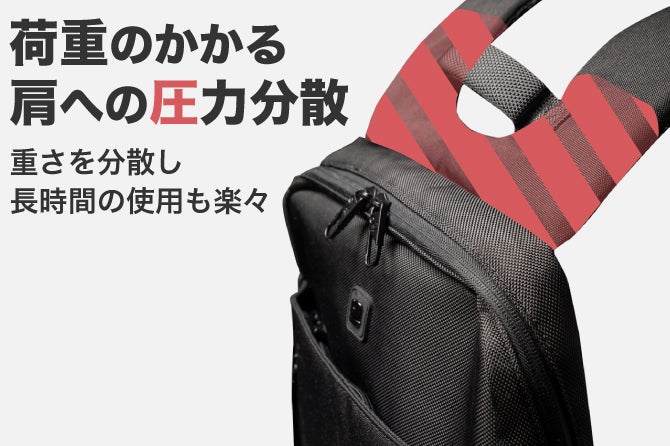 また、重たい荷物を運ぶ際にも工夫が施されています。肩に当たる部分のベルトの形状に工夫を加え、圧力の分散をさせる設計となっています。