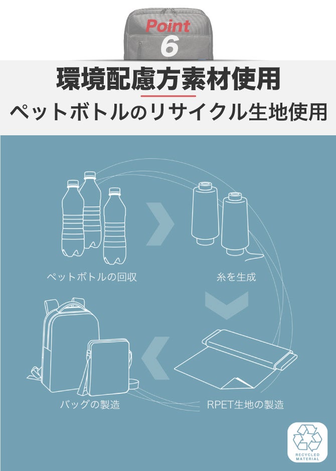 このビジネスリュックは、リサイクル生地を使用して作られている環境配慮方のバッグです。環境問題を気にするエコな姿勢をアピールすることも出来るこのビジネスリュックは、都会で働くあなたにピッタリのものと言えるでしょう。