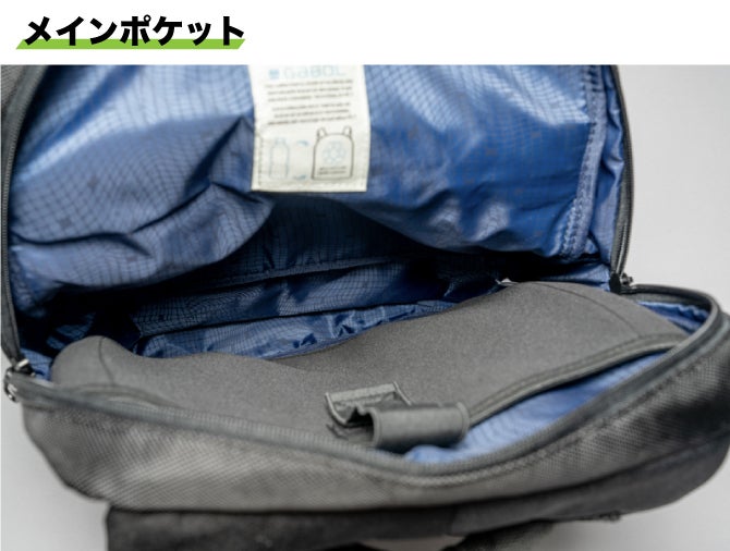 メインポケット部分は通常時は9Lの容量となっています。拡張部分を広げるとその容量は11Lと広がります。